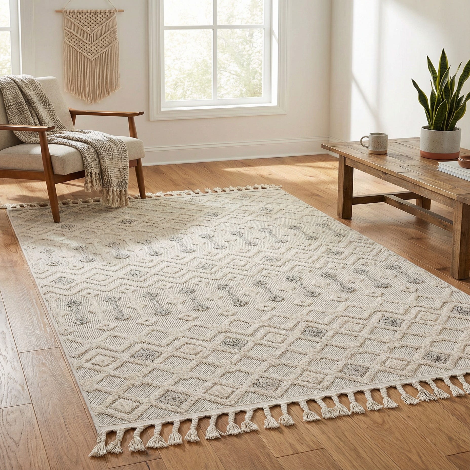 Primary color is Sandy Beige. Colors in this rug include: Sandy Beige, Beige, Gray.