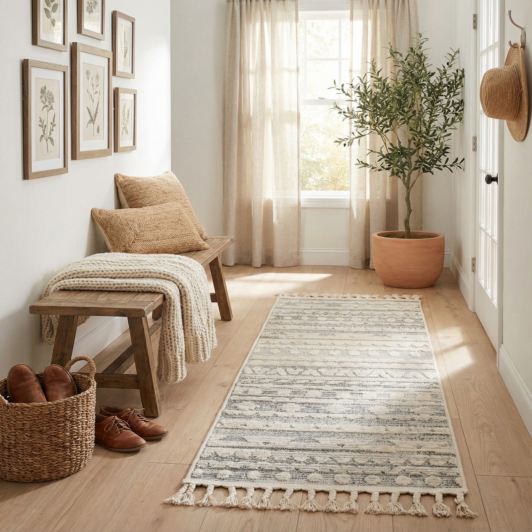 Primary color is Sandy Beige. Colors in this rug include: Sandy Beige, Beige, Gray.