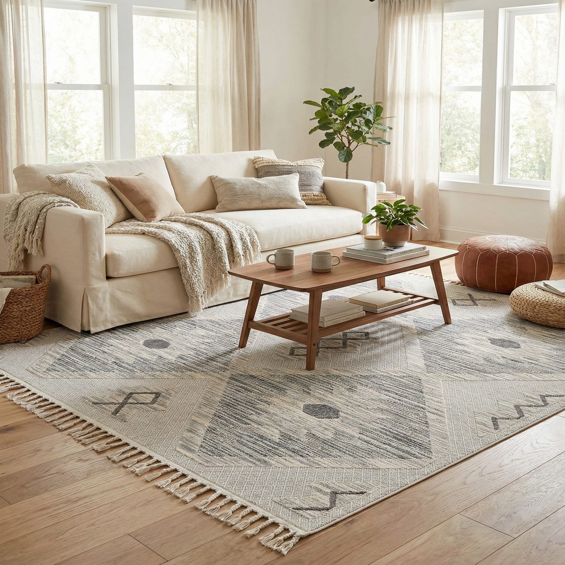 Primary color is Sandy Beige. Colors in this rug include: Sandy Beige, Beige, Gray.