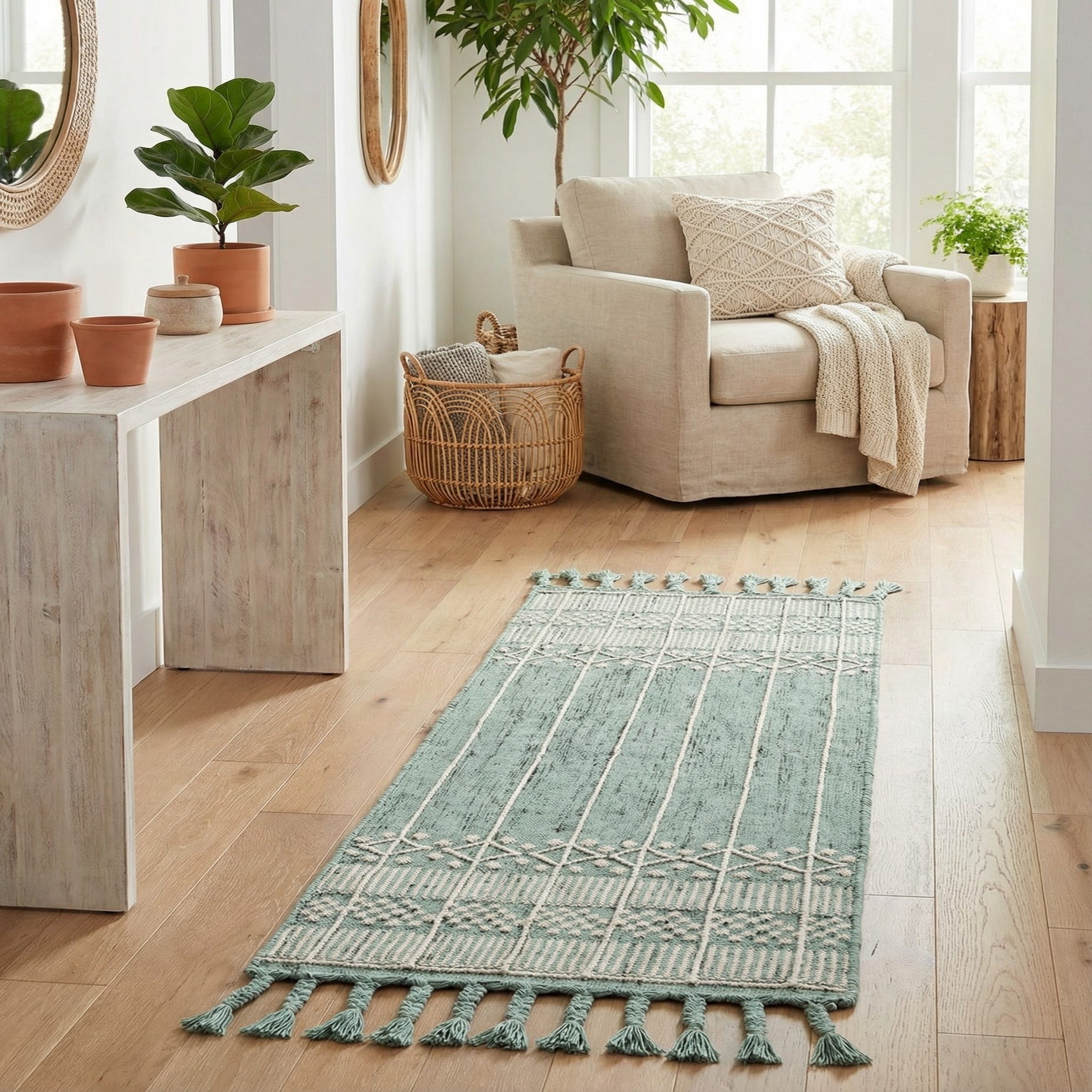 Primary color is Sea Green. Colors in this rug include: Sea Green, Ivory.