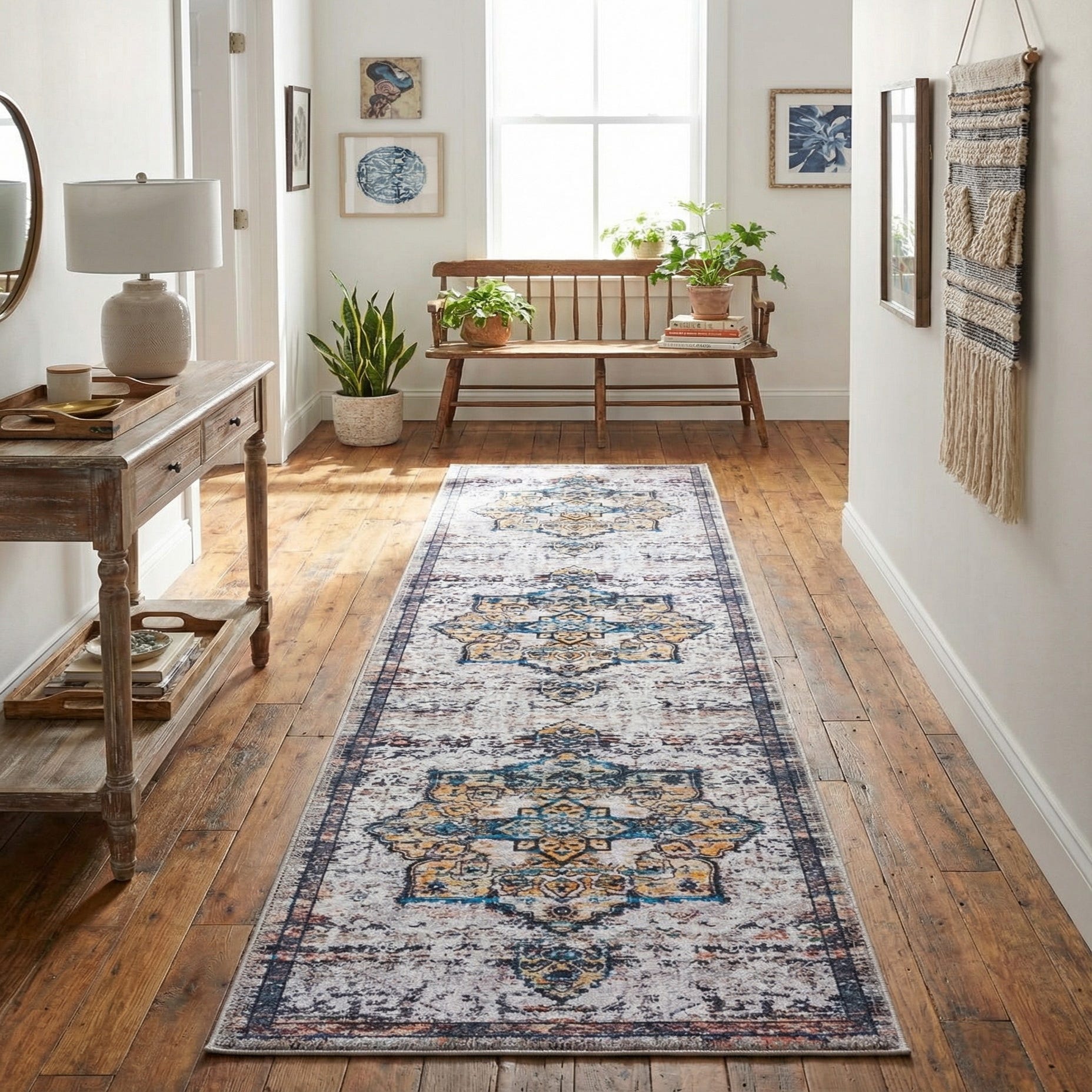 Primary color is Sea Salt White. Colors in this rug include: Sea Salt White, Black, Blue, Orange, Yellow.