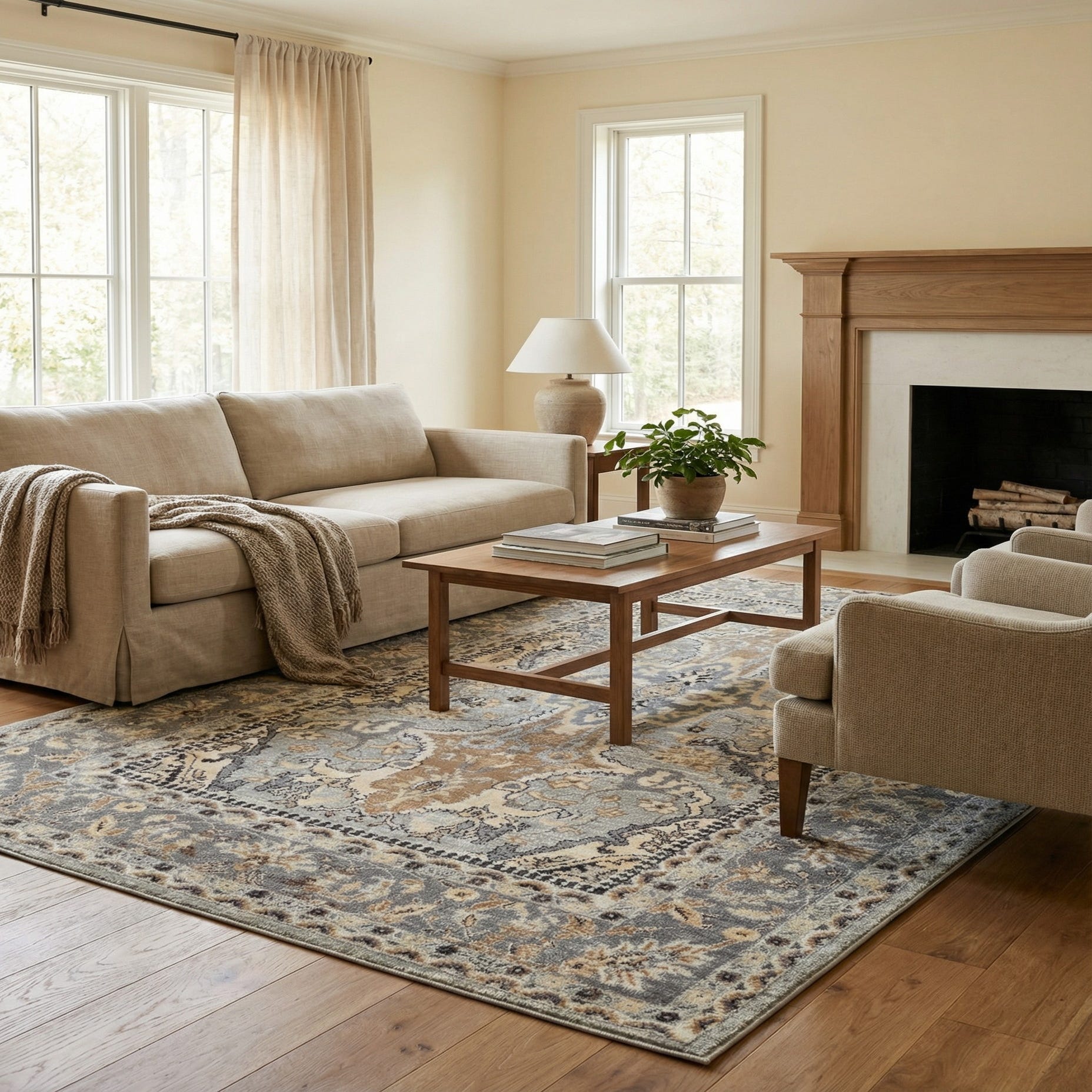 Primary color is Silver. Colors in this rug include: Silver, Gray, Light Brown, Tan.