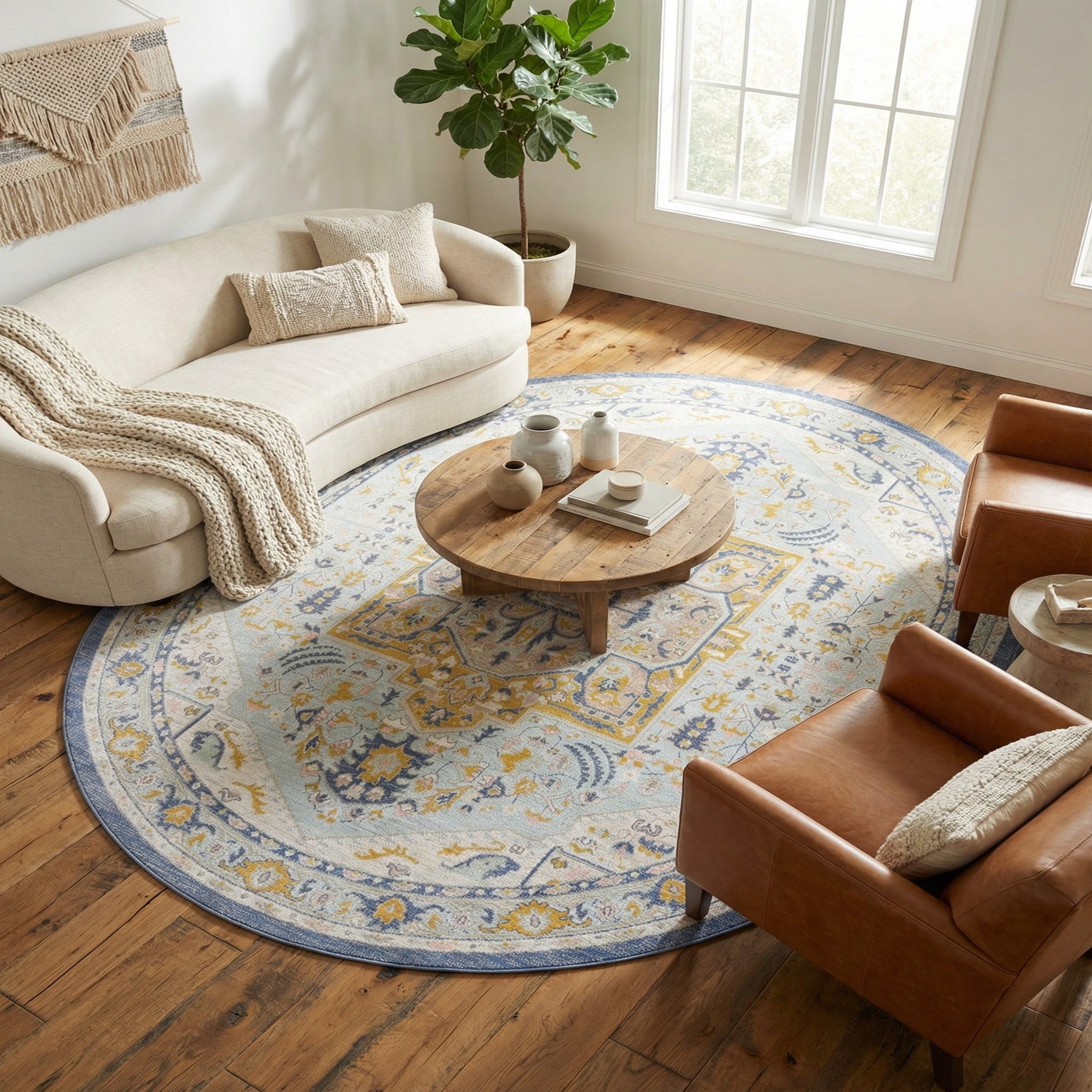 Primary color is Sky blue. Colors in this rug include: Sky blue, Ivory, Light Blue, Pink, Gold, Gray.