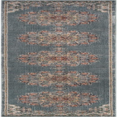 Primary color is Slate Blue. Colors in this rug include: Slate Blue, Beige, Black, Green, Ivory, Light Blue, Navy Blue, Orange, Rust Red.
