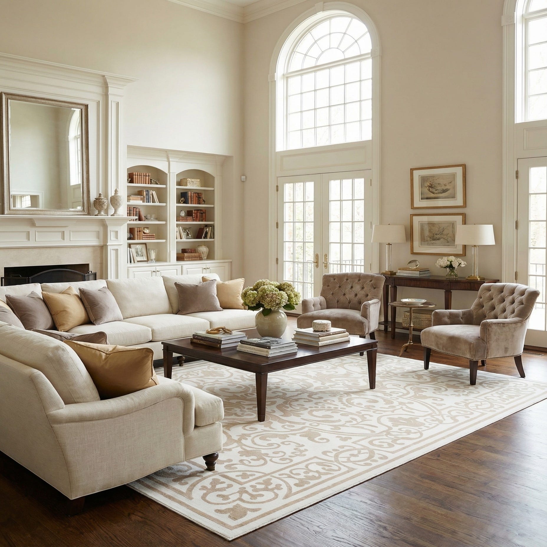 Primary color is Snow White. Colors in this rug include: Snow White, Beige.