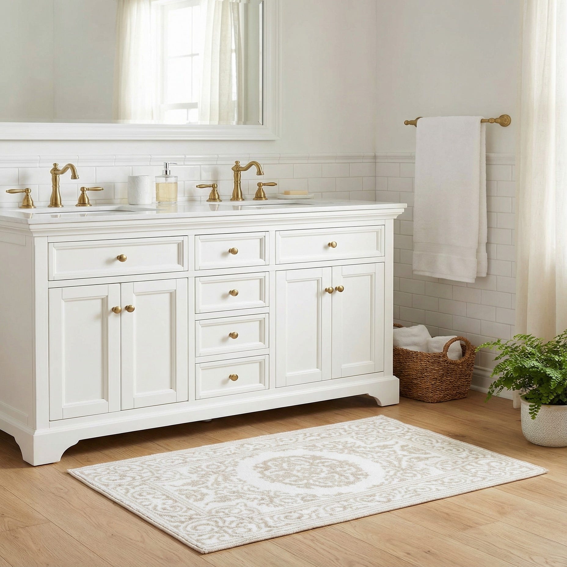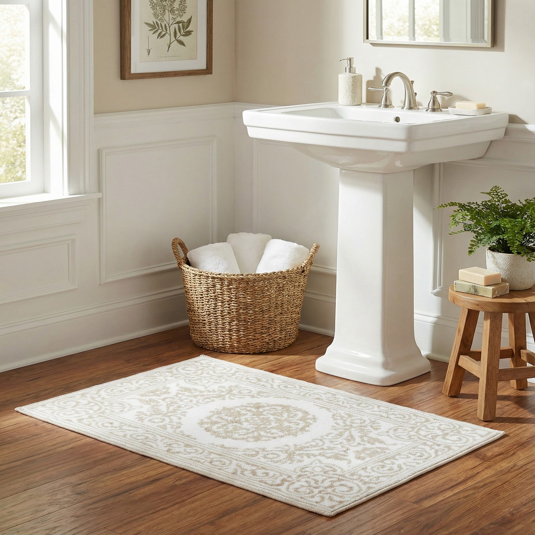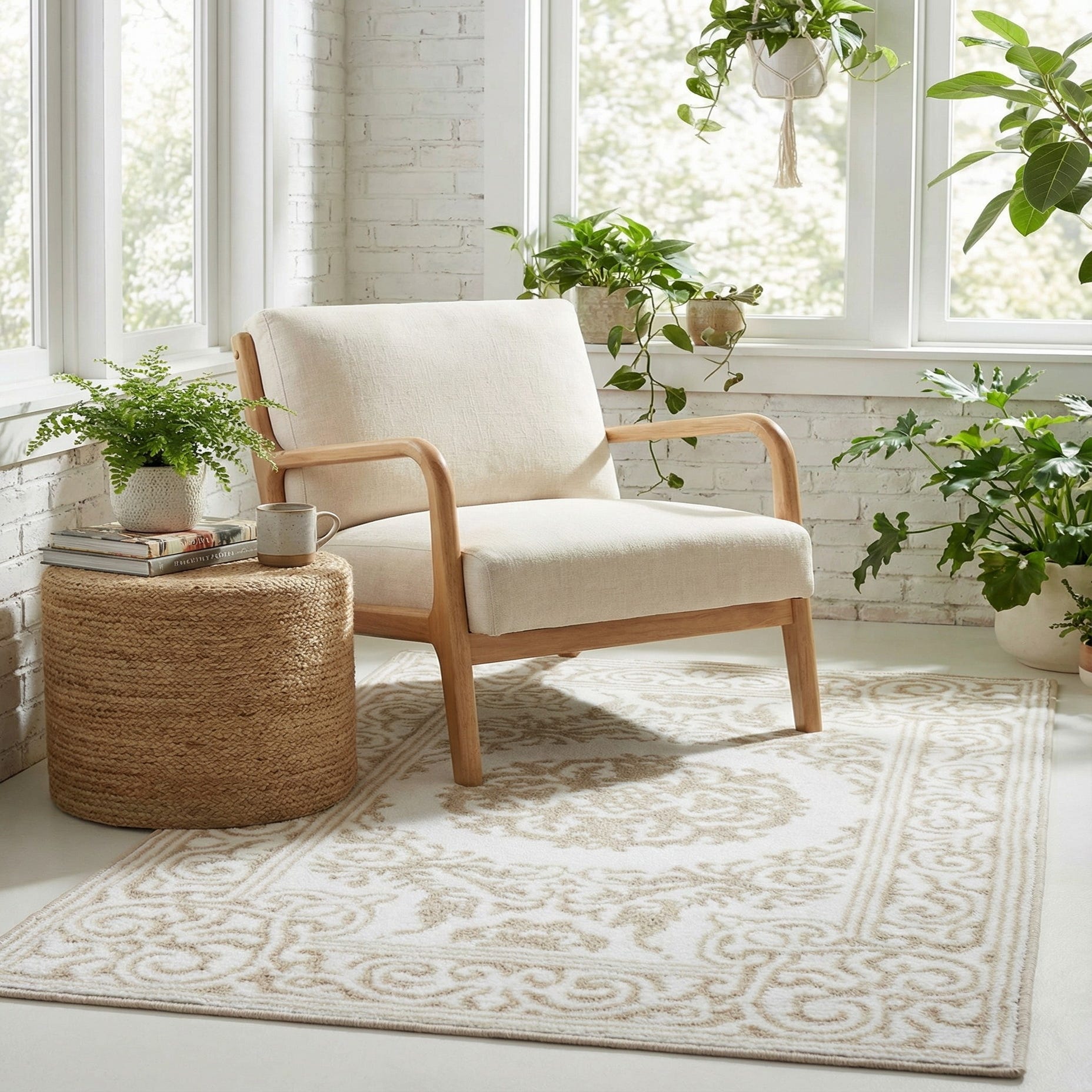 Primary color is Snow White. Colors in this rug include: Snow White, Beige.