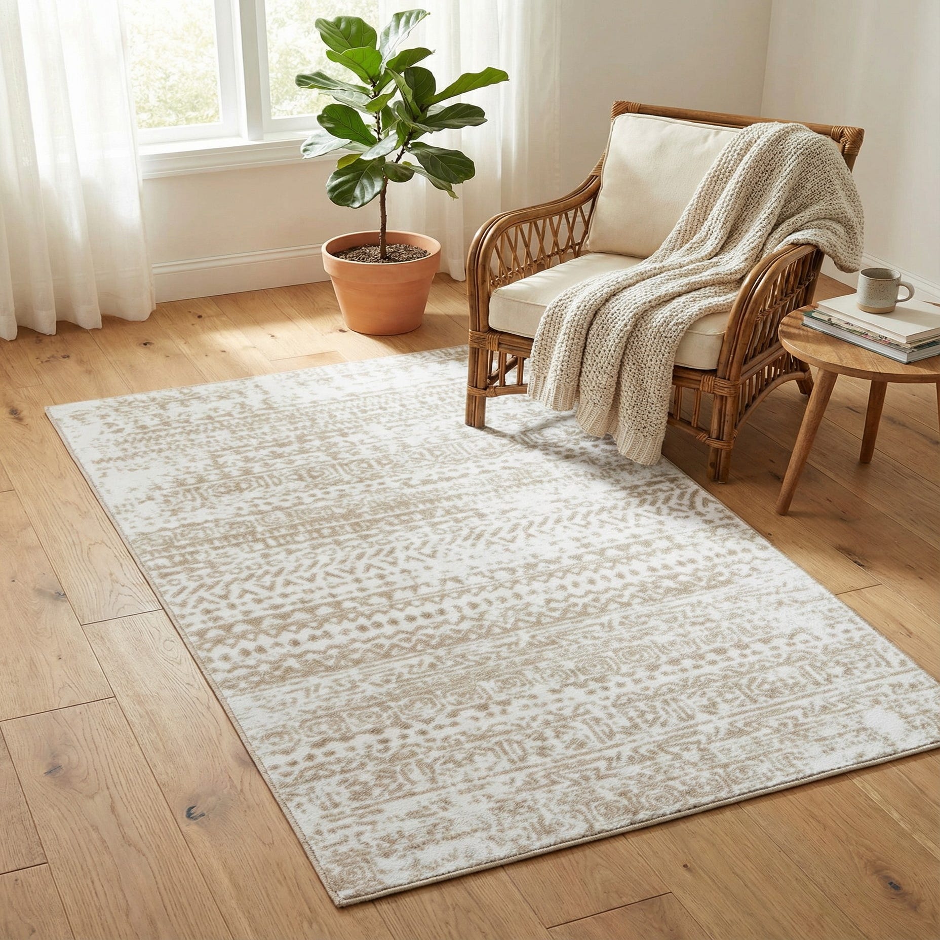 Primary color is Snow White. Colors in this rug include: Snow White, Beige.