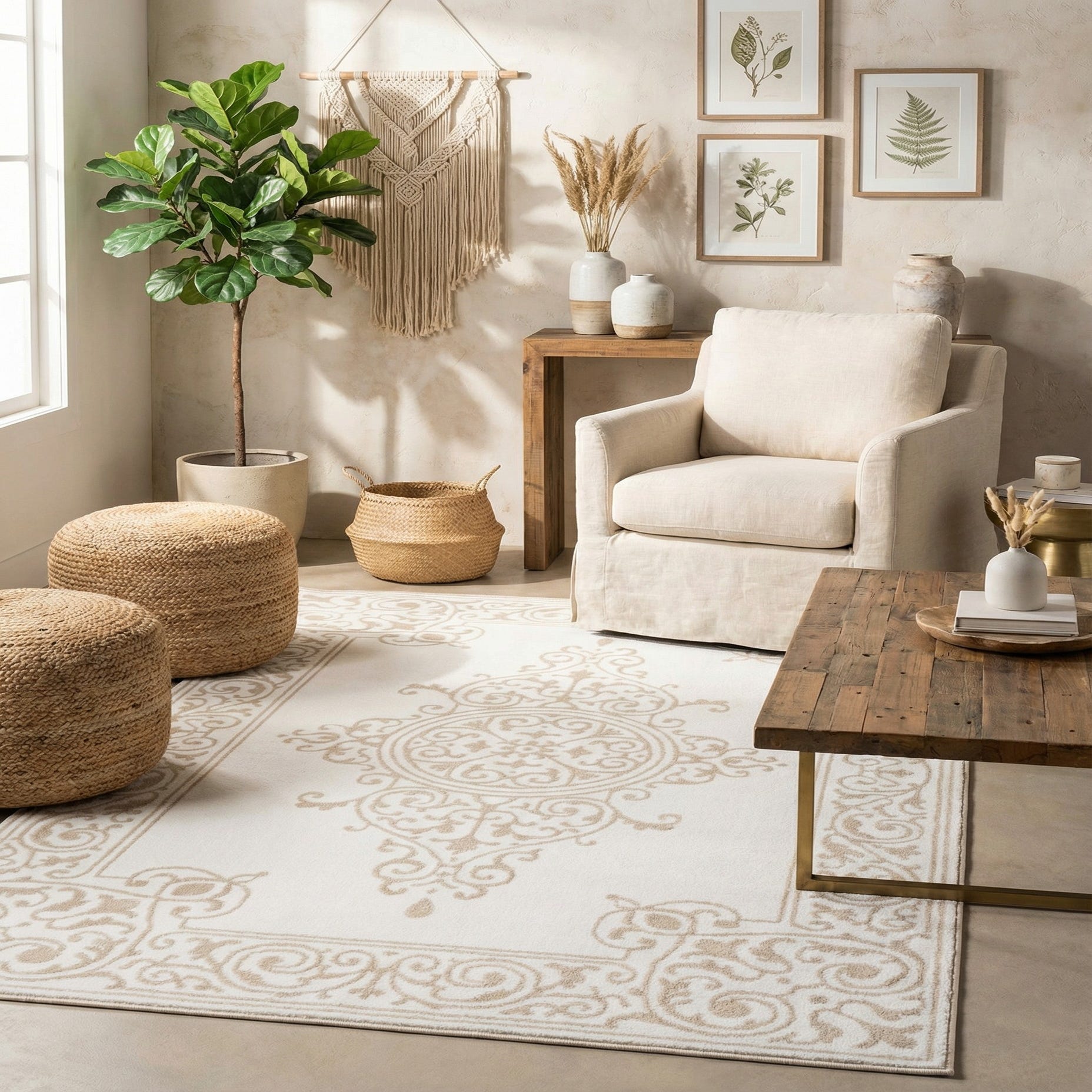 Primary color is Snow White. Colors in this rug include: Snow White, Beige.