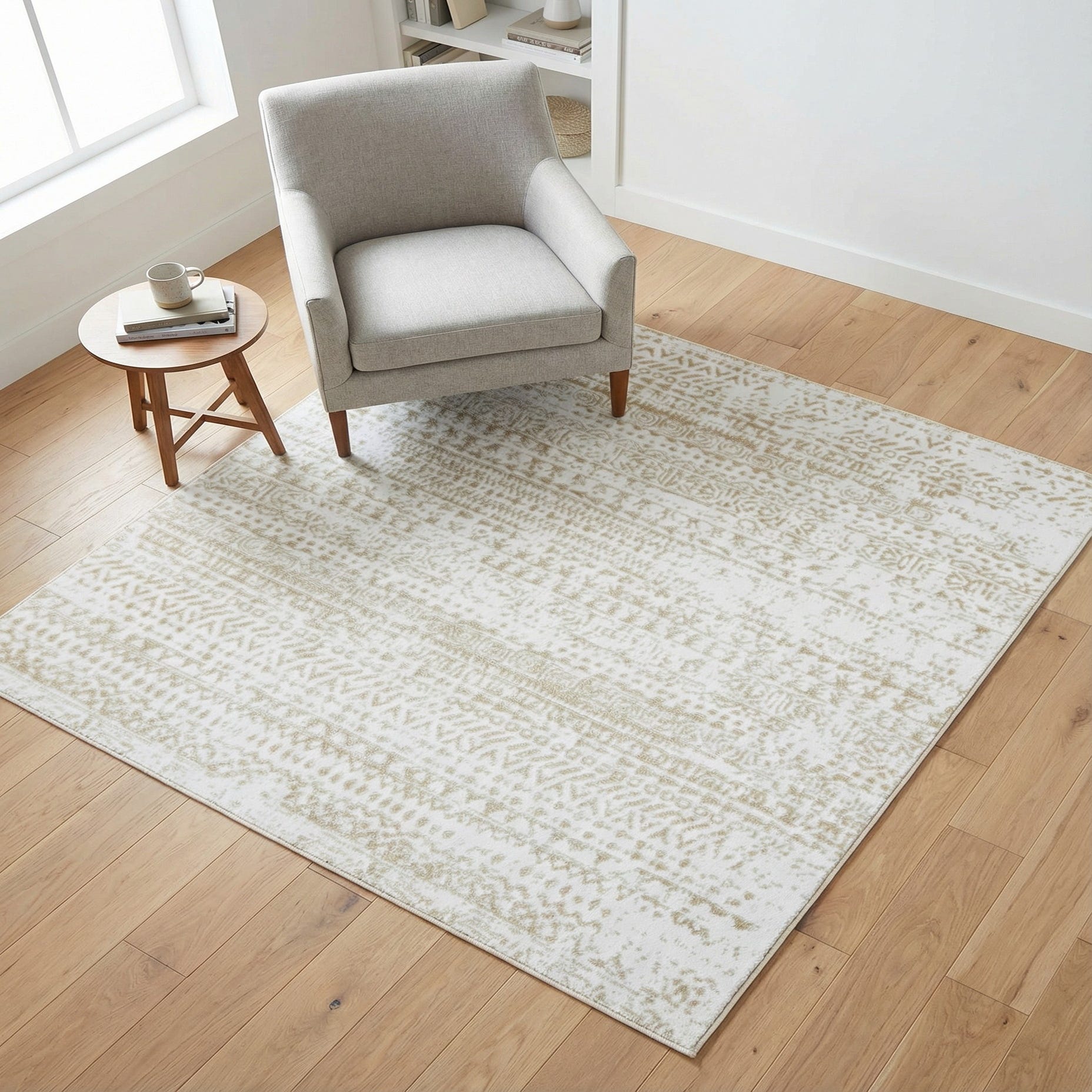 Primary color is Snow White. Colors in this rug include: Snow White, Beige.