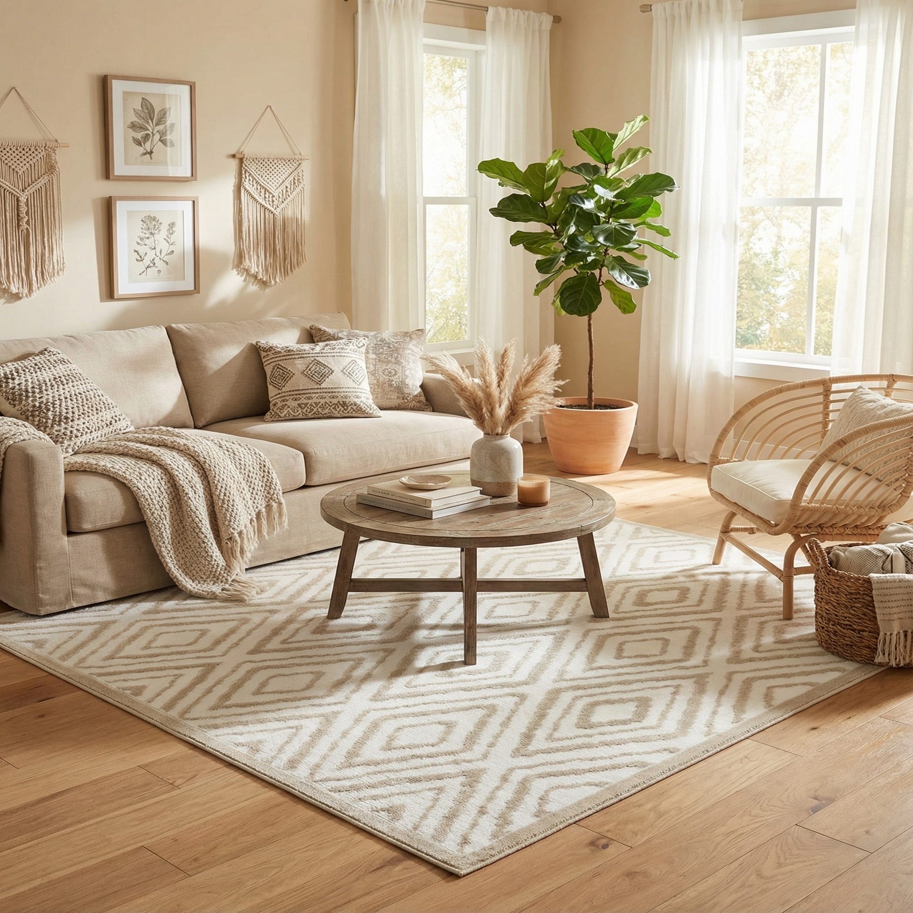 Primary color is Snow White. Colors in this rug include: Snow White, Beige.