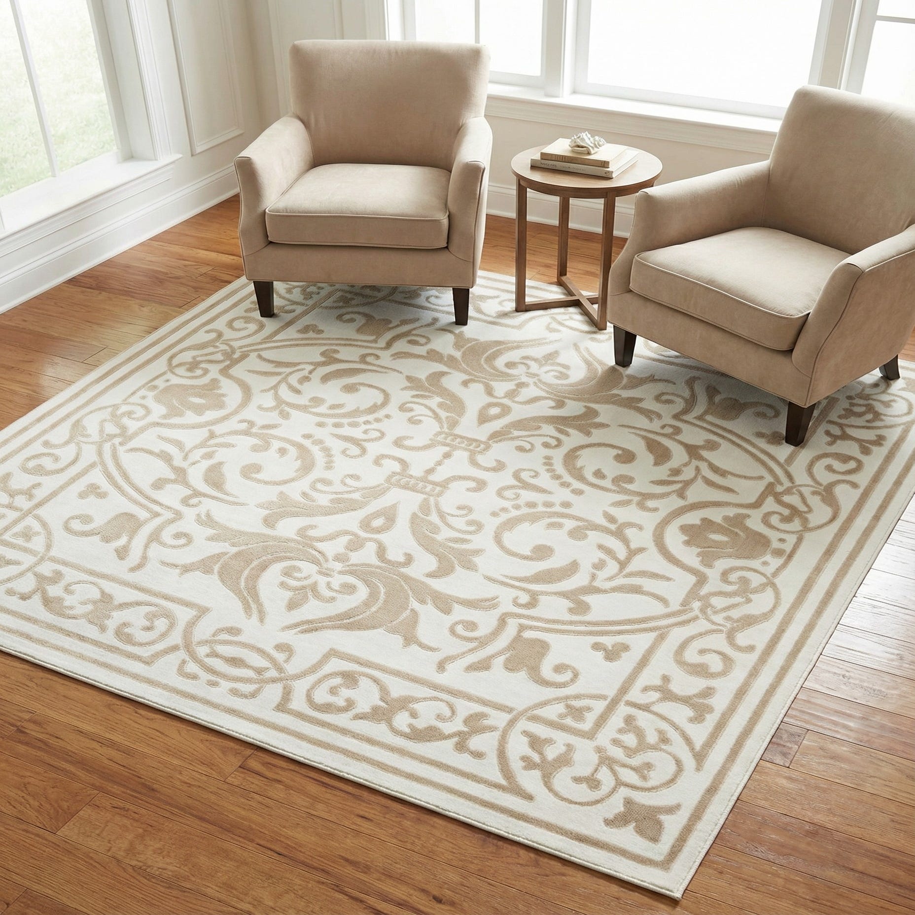 Primary color is Snow White. Colors in this rug include: Snow White, Beige.