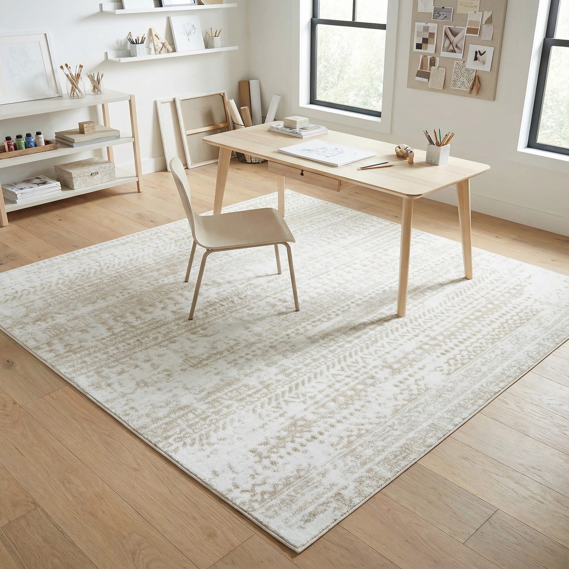 Primary color is Snow White. Colors in this rug include: Snow White, Beige.