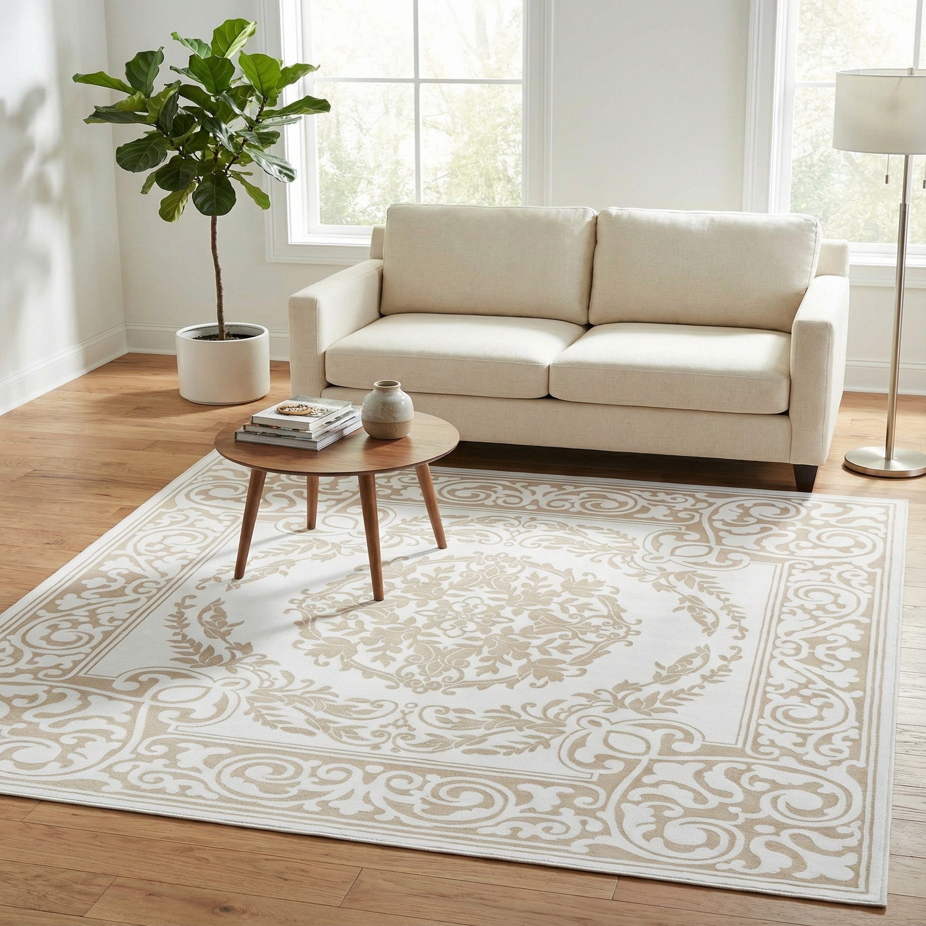Primary color is Snow White. Colors in this rug include: Snow White, Beige.