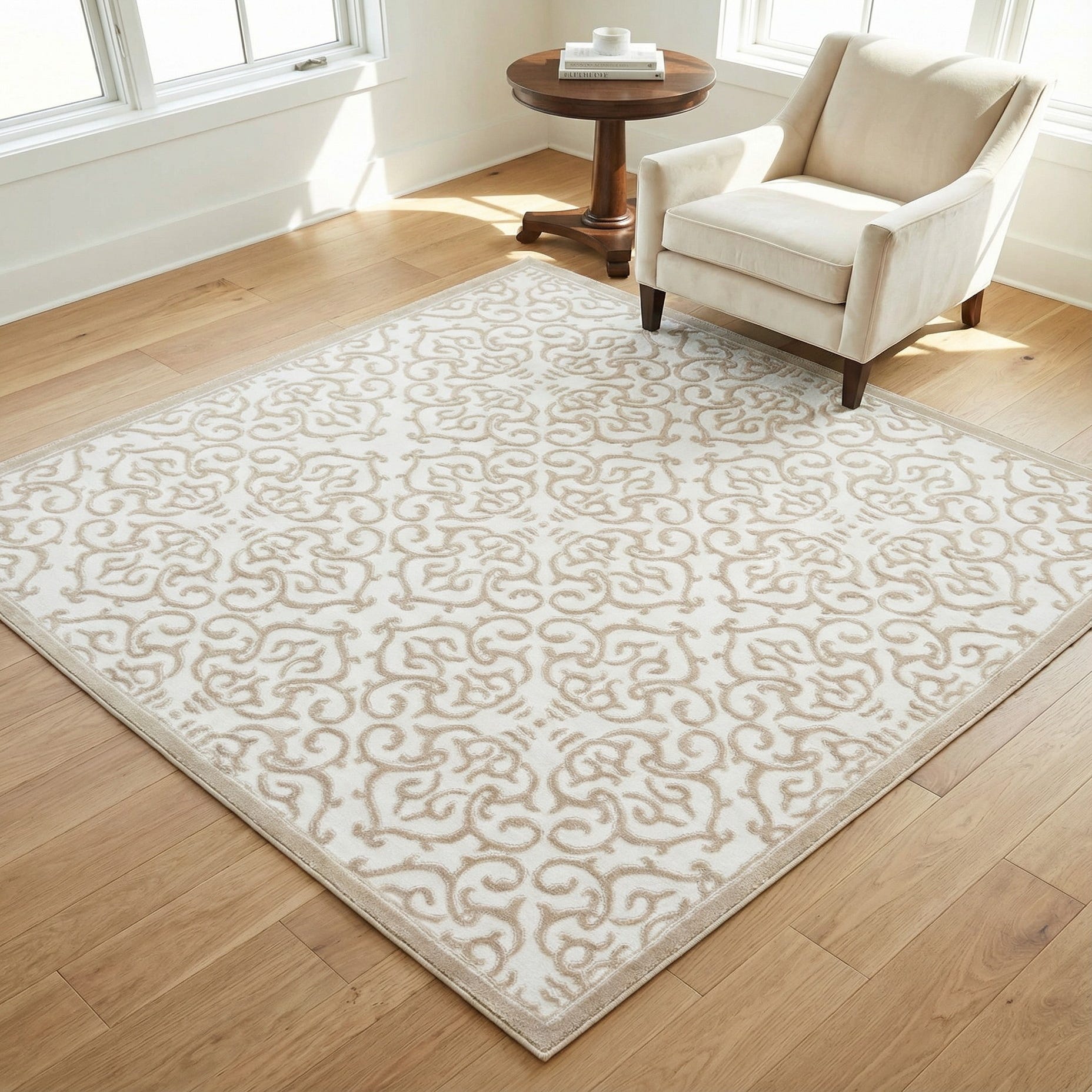 Primary color is Snow White. Colors in this rug include: Snow White, Beige.