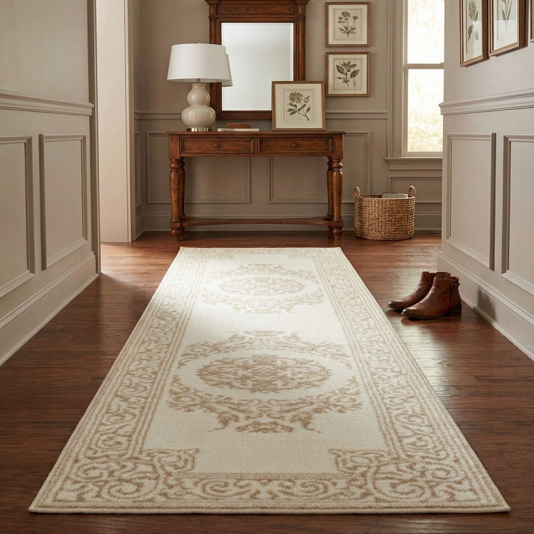 Primary color is Snow White. Colors in this rug include: Snow White, Beige.