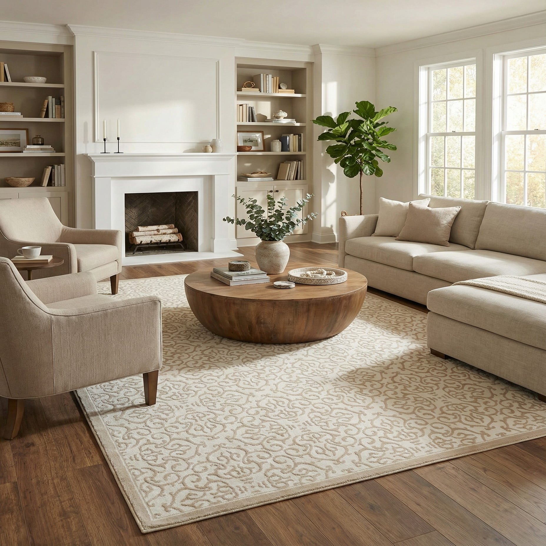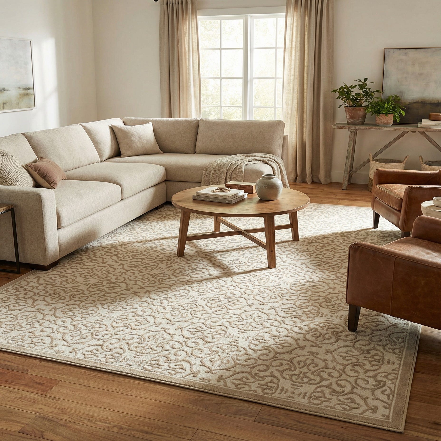 Primary color is Snow White. Colors in this rug include: Snow White, Beige.