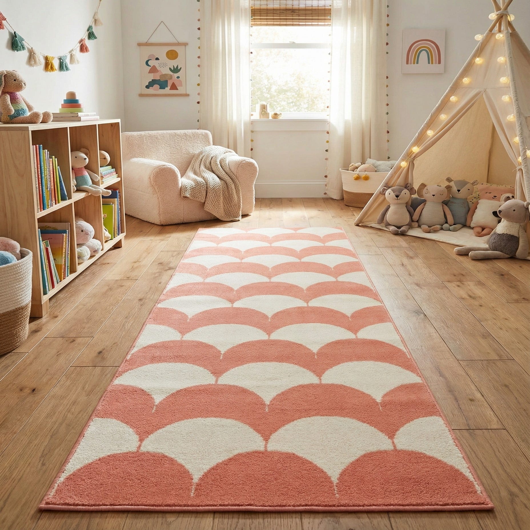 Primary color is Soft Coral Pink. Colors in this rug include: Soft Coral Pink, Ivory.
