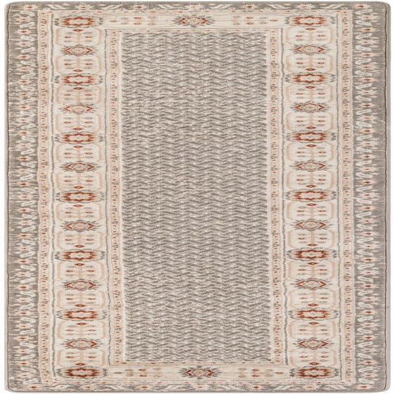 Primary color is Steel gray. Colors in this rug include: Steel gray, Ivory, Rust Red.