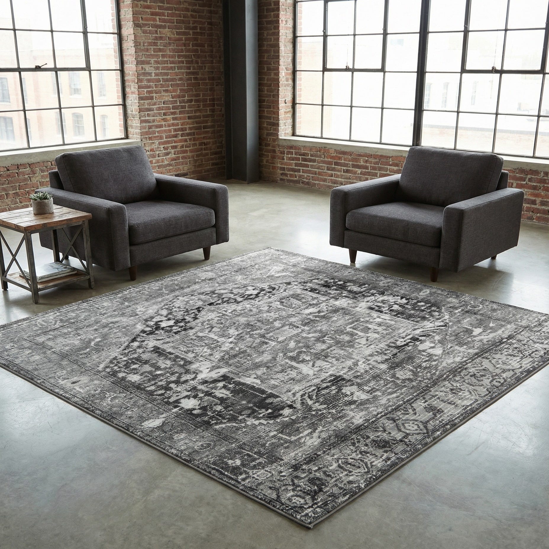 Primary color is Steel Gray. Colors in this rug include: Steel Gray, Black, Ivory.