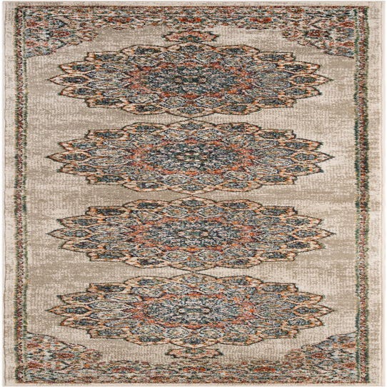 Primary color is Stone Beige. Colors in this rug include: Stone Beige, Beige, Black, Blue, Gray, Green, Ivory, Light Brown, Orange, Navy Blue, Red, Rust Red.