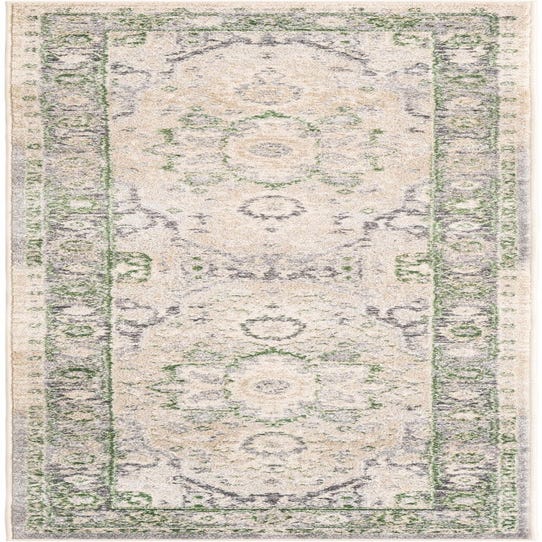 Primary color is Stone Gray. Colors in this rug include: Stone Gray, Ivory, Green.