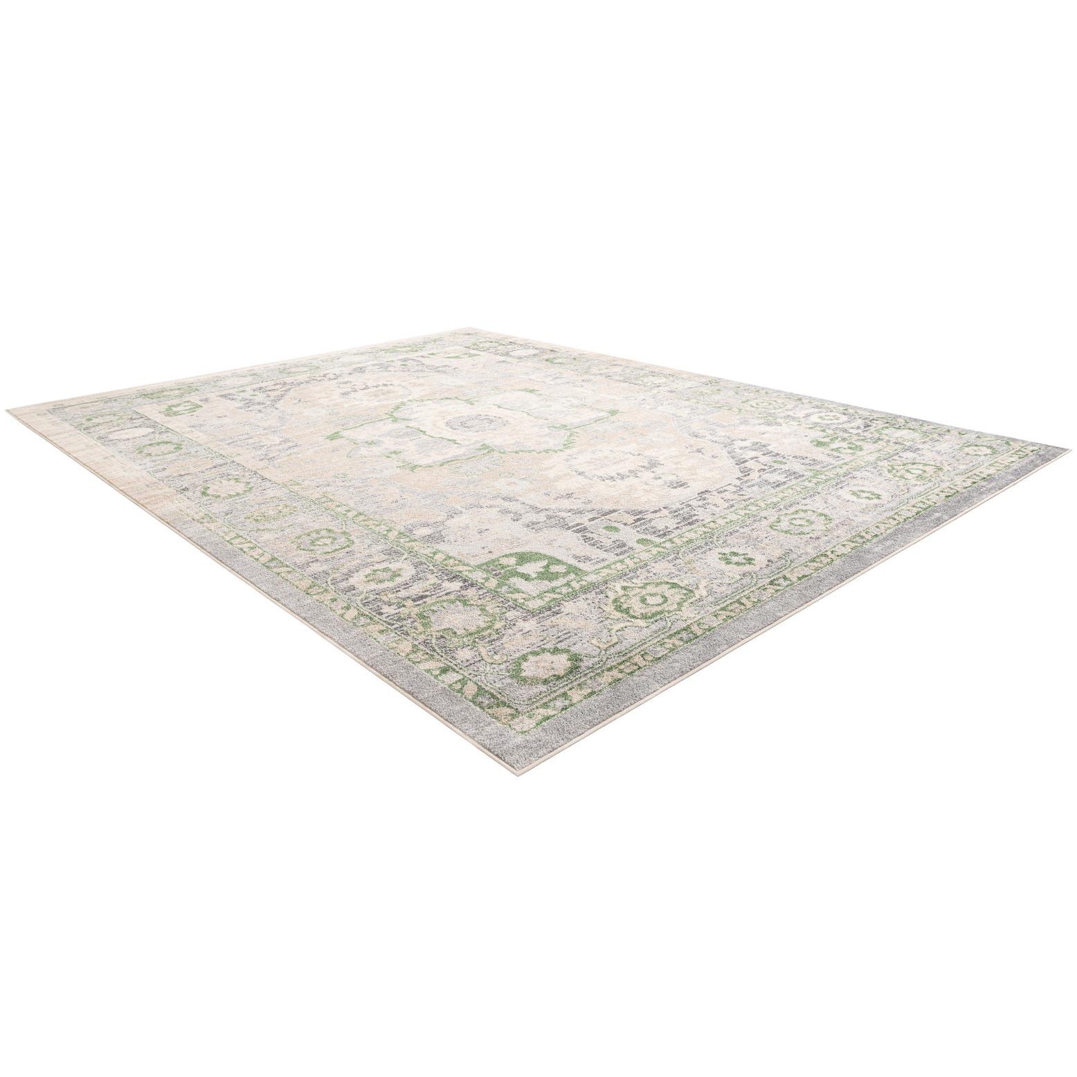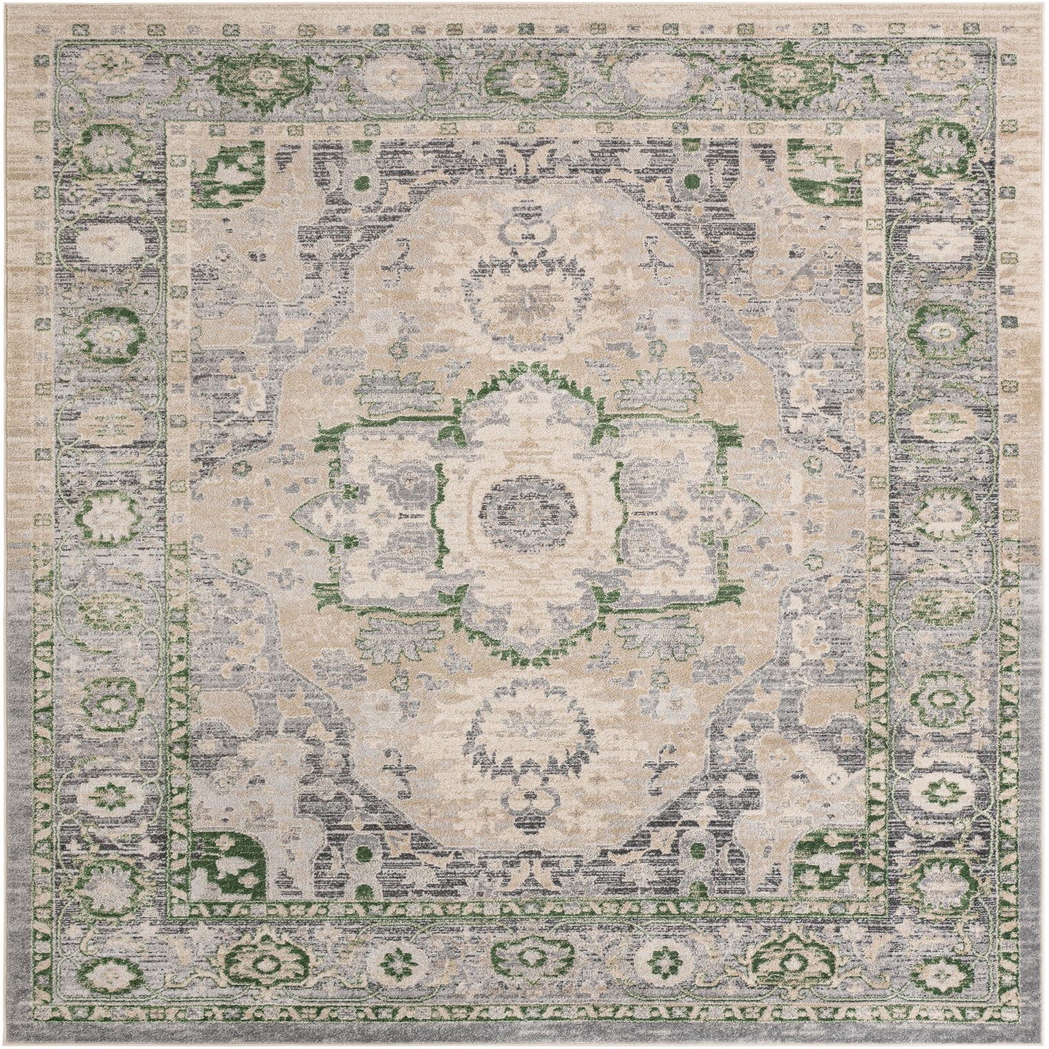 Primary color is Stone Gray. Colors in this rug include: Stone Gray, Green, Ivory.