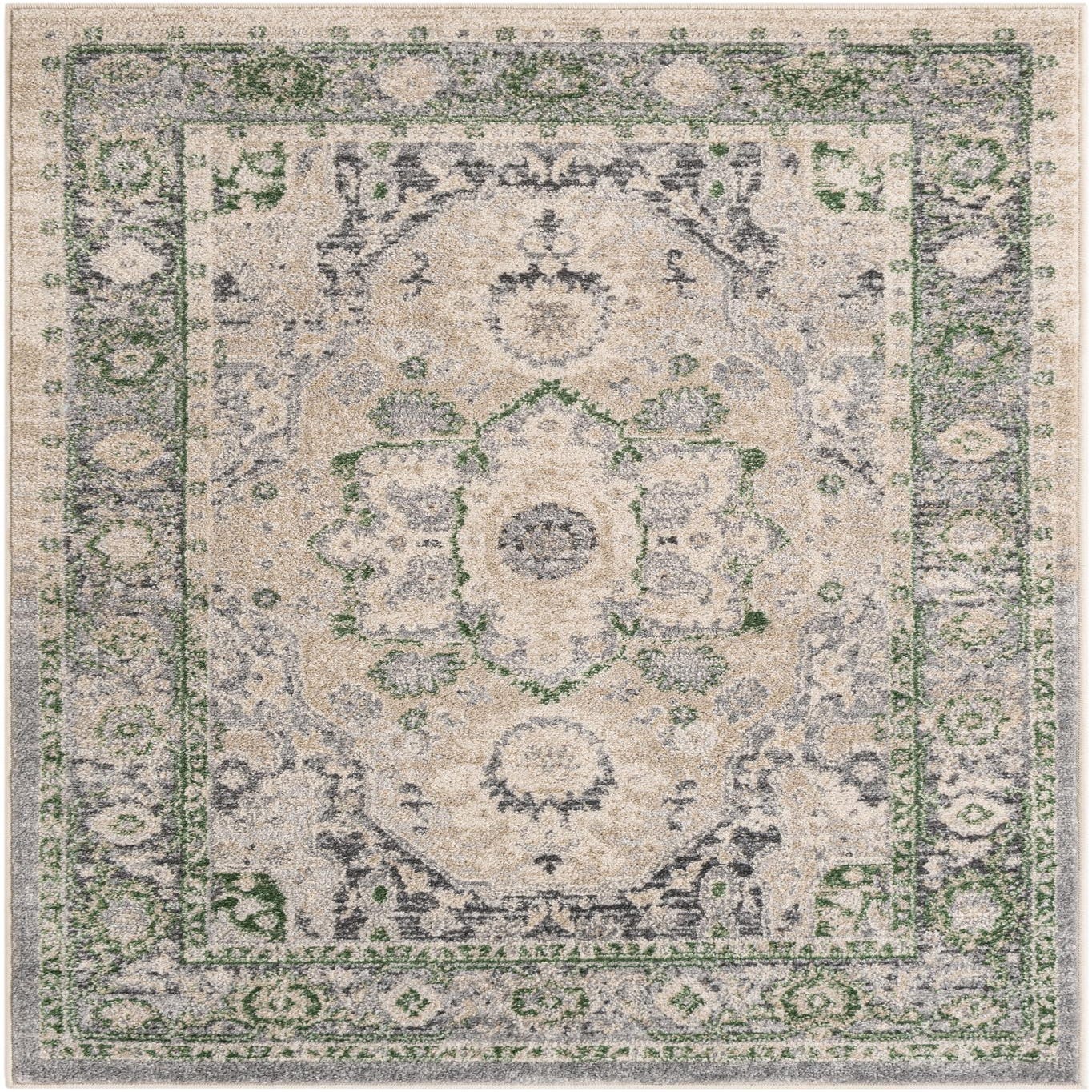 Primary color is Stone Gray. Colors in this rug include: Stone Gray, Ivory, Green.