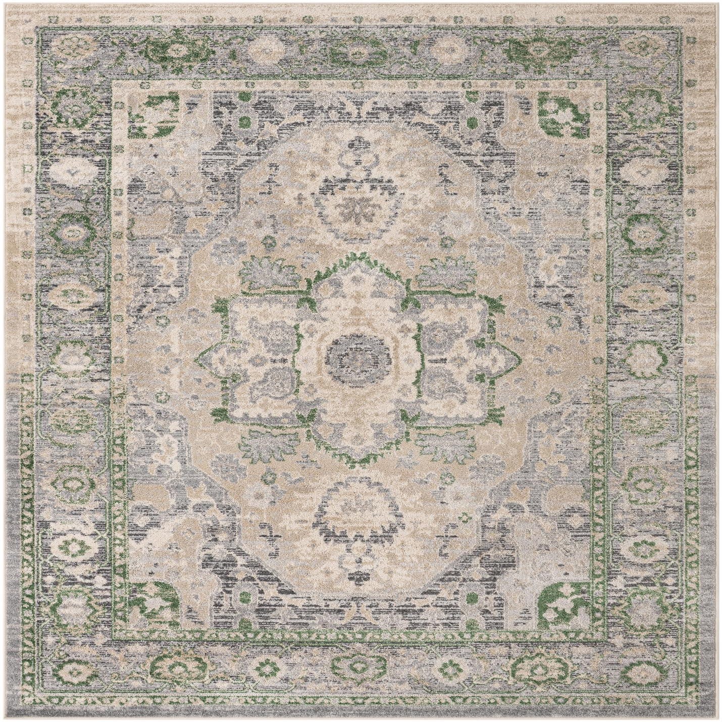 Primary color is Stone Gray. Colors in this rug include: Stone Gray, Green, Ivory.
