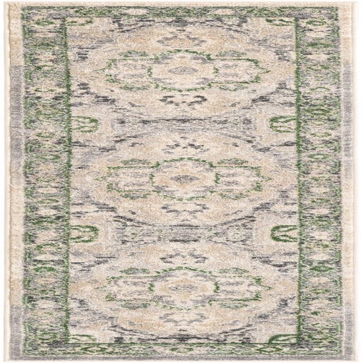 Primary color is Stone Gray. Colors in this rug include: Stone Gray, Ivory, Green.