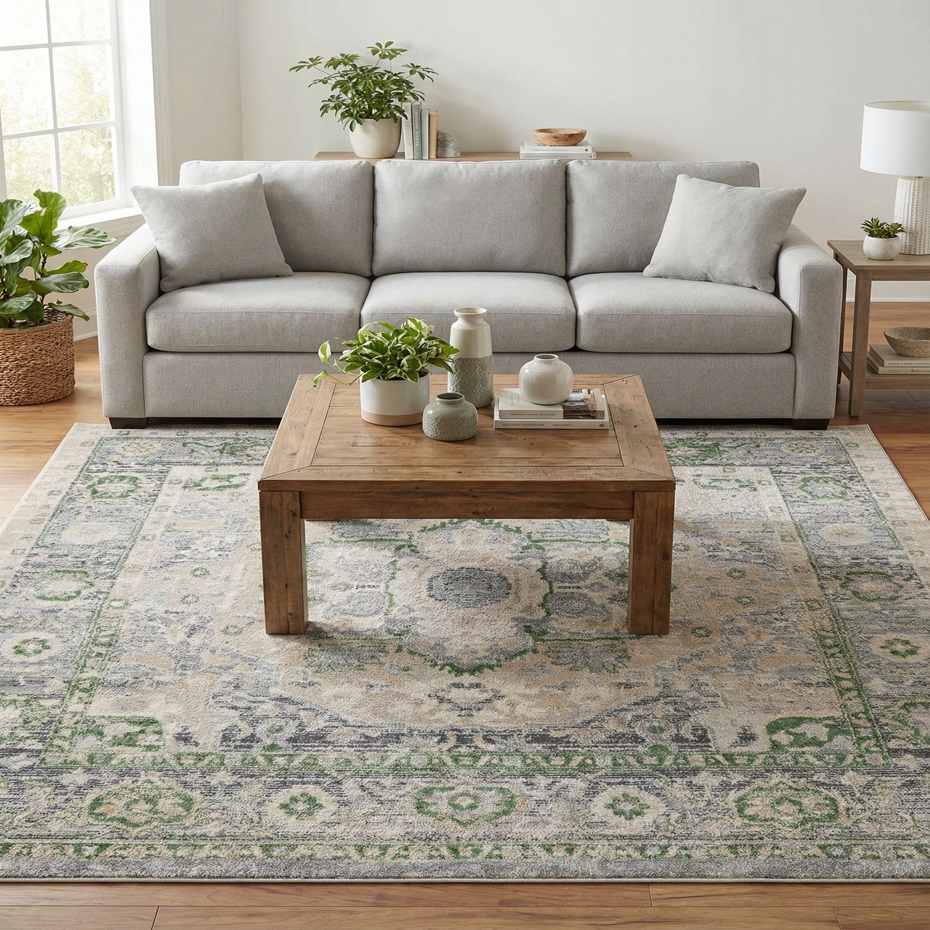 Primary color is Stone Gray. Colors in this rug include: Stone Gray, Ivory, Green.