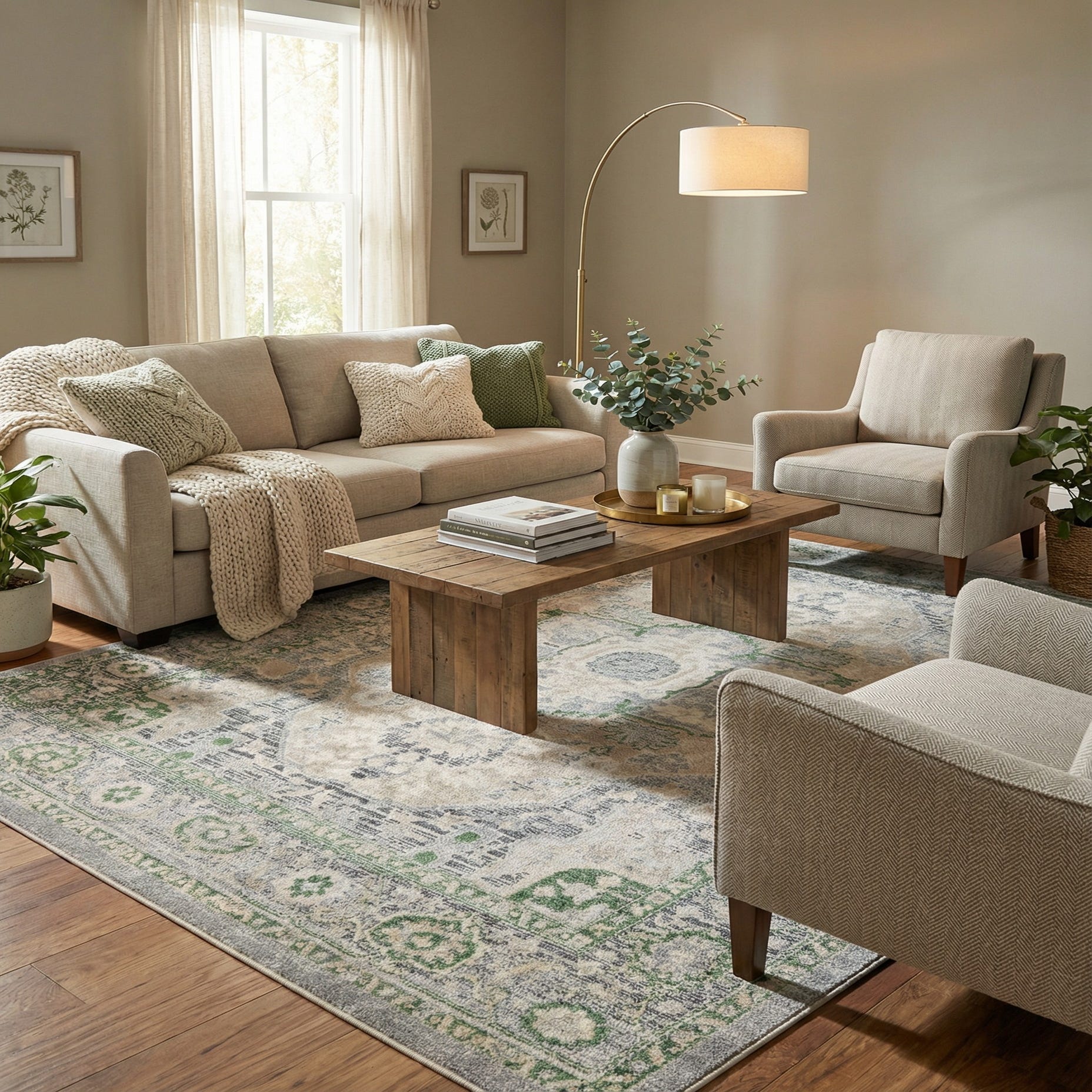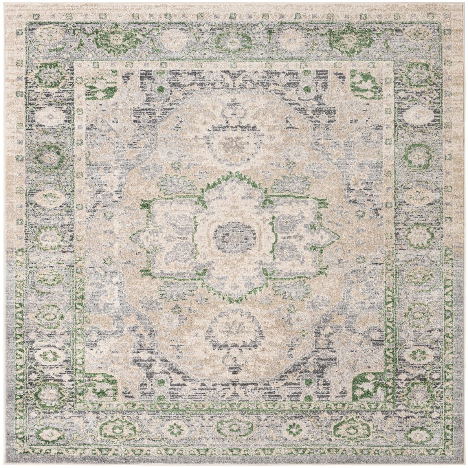 Primary color is Stone Gray. Colors in this rug include: Stone Gray, Green, Ivory.