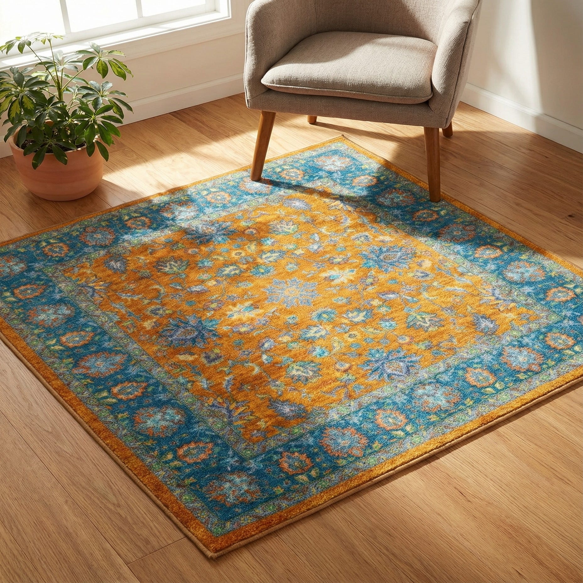 Primary color is Sunshine Yellow. Colors in this rug include: Sunshine Yellow, Blue, Green, Light Blue.