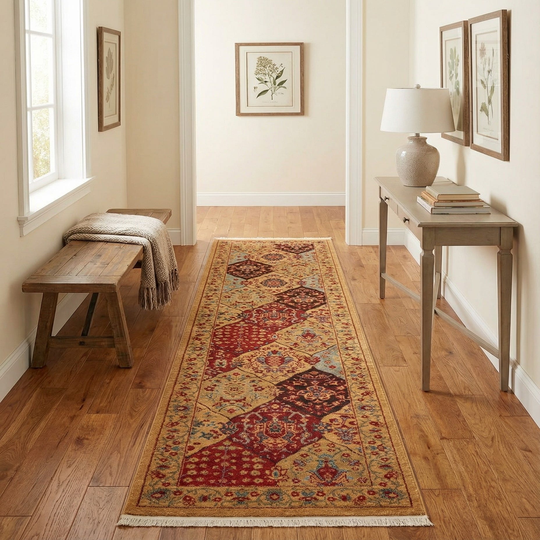 Primary color is Tan. Colors in this rug include: Tan, Red, Brown, Blue, Green, Navy Blue.