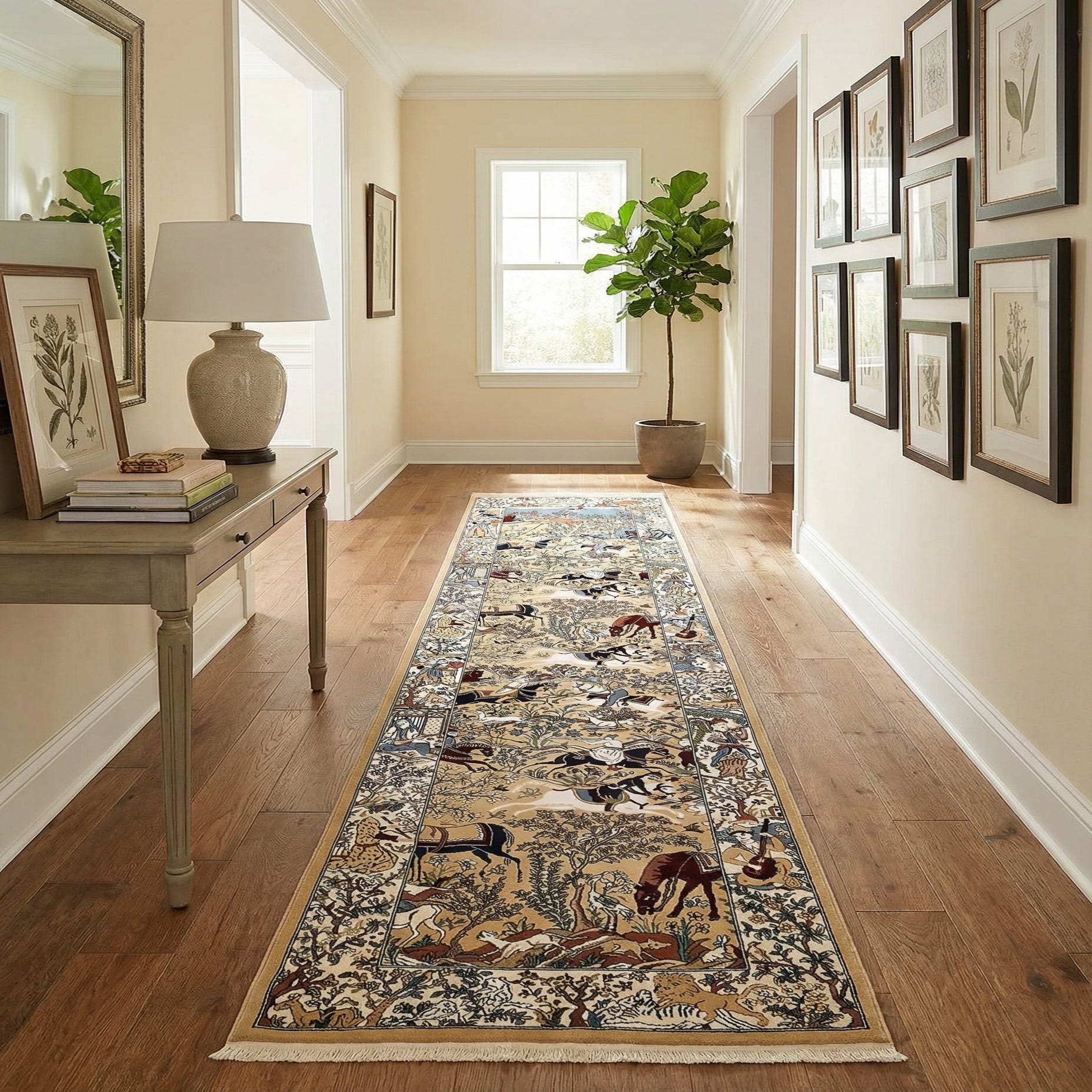 Primary color is Tan. Colors in this rug include: Tan, Blue, Burgundy, Cream, Green, Ivory, Navy Blue, Plum Red.