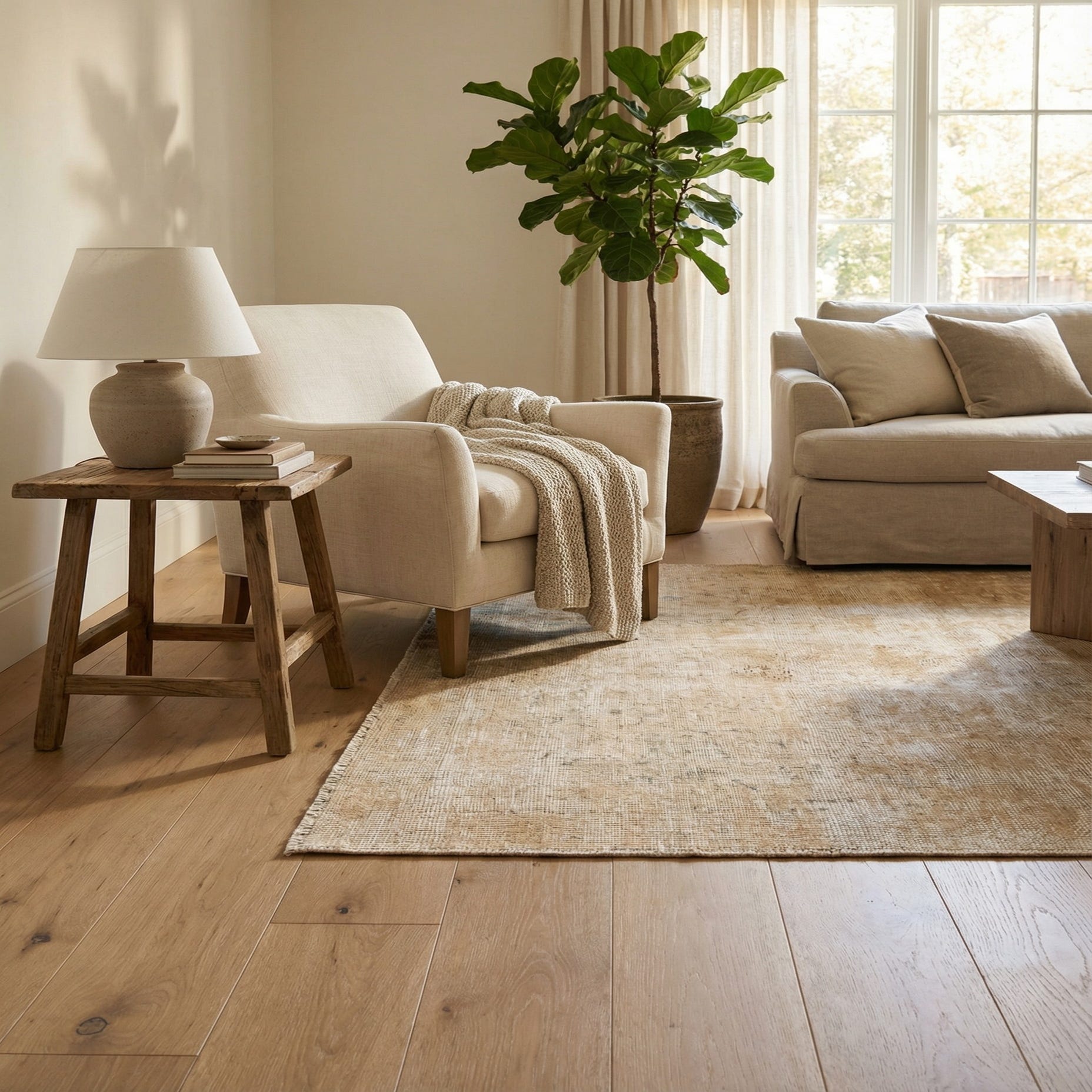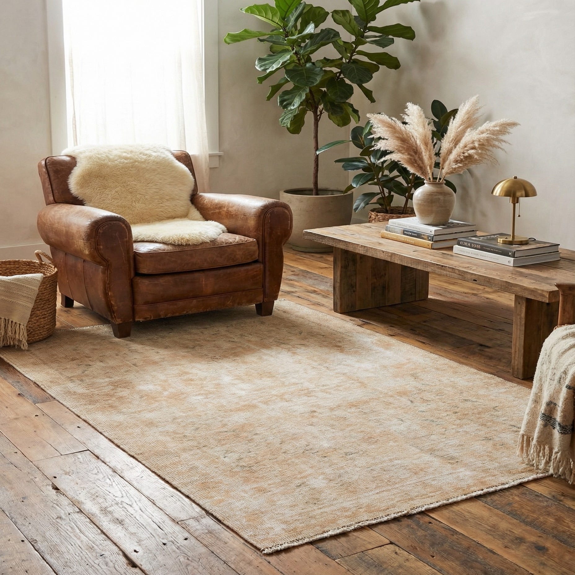 Primary color is Tan. Colors in this rug include: Tan, Ivory.
