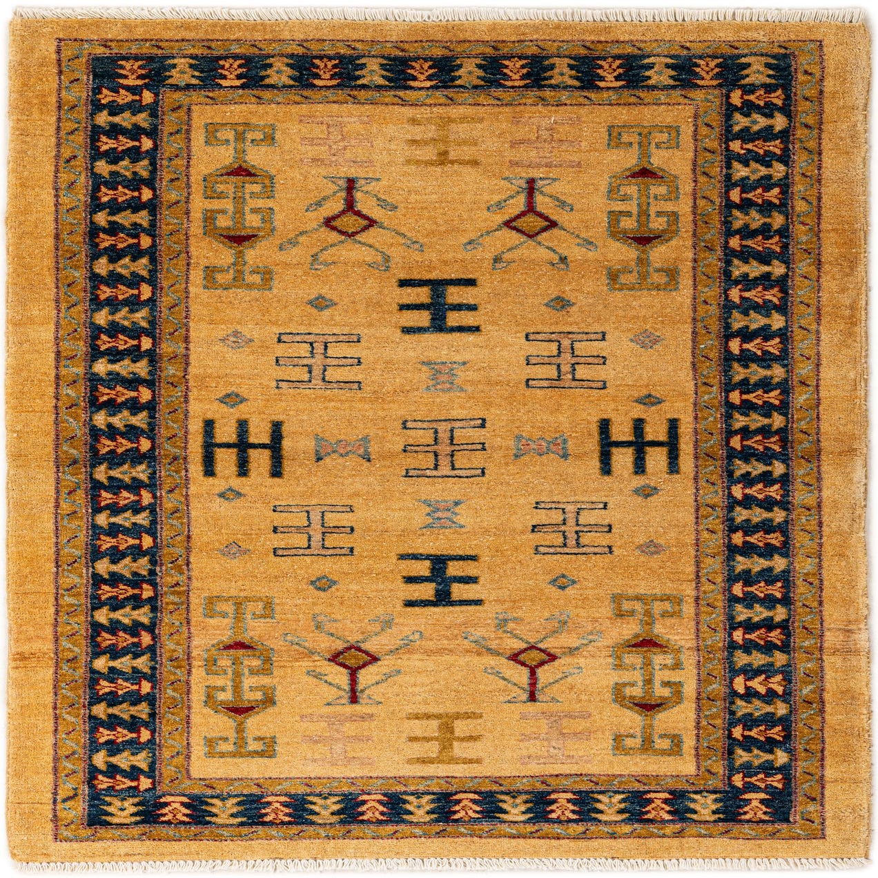 Primary color is Tan. Colors in this rug include: Tan, Beige, Brown, Blue, Red, Olive.