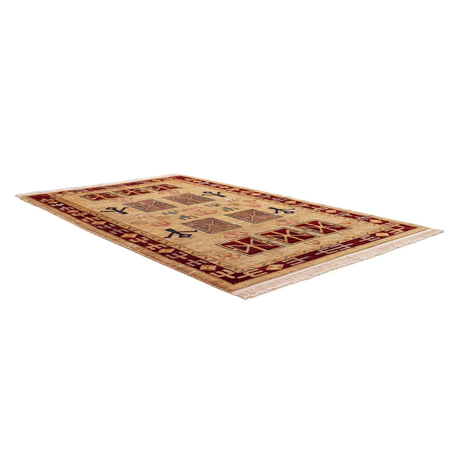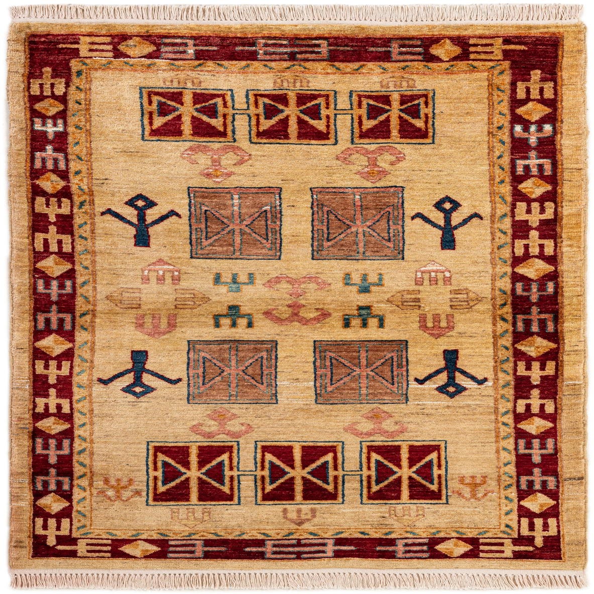 Primary color is Tan. Colors in this rug include: Tan, Beige, Black, Brown, Navy Blue, Peach, Red, Yellow, Blue, Ivory.