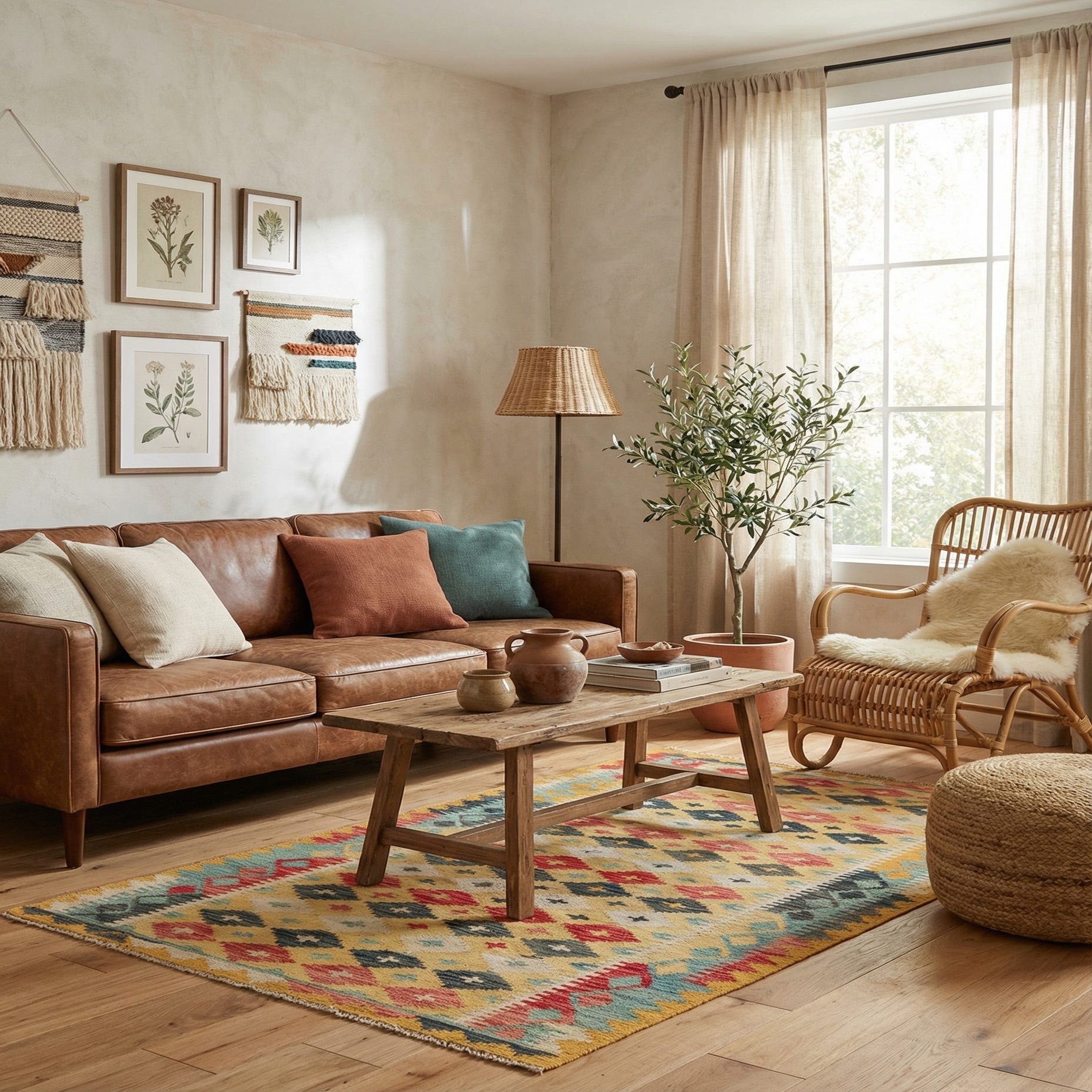 Primary color is Tan. Colors in this rug include: Tan, Beige, Black, Ivory, Red, Orange, Blue.