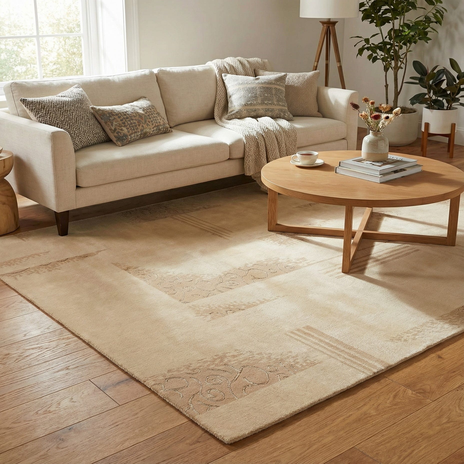 Primary color is Tan. Colors in this rug include: Tan, Light Brown, Gold.