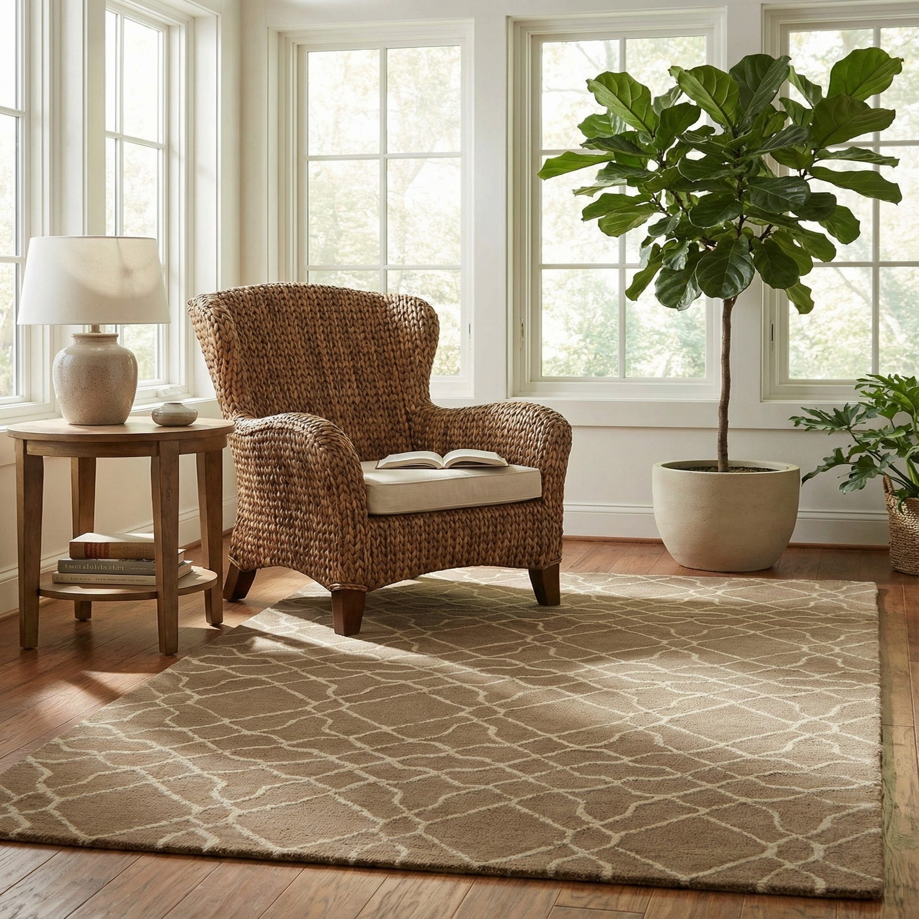 Primary color is Tan. Colors in this rug include: Tan, Ivory.