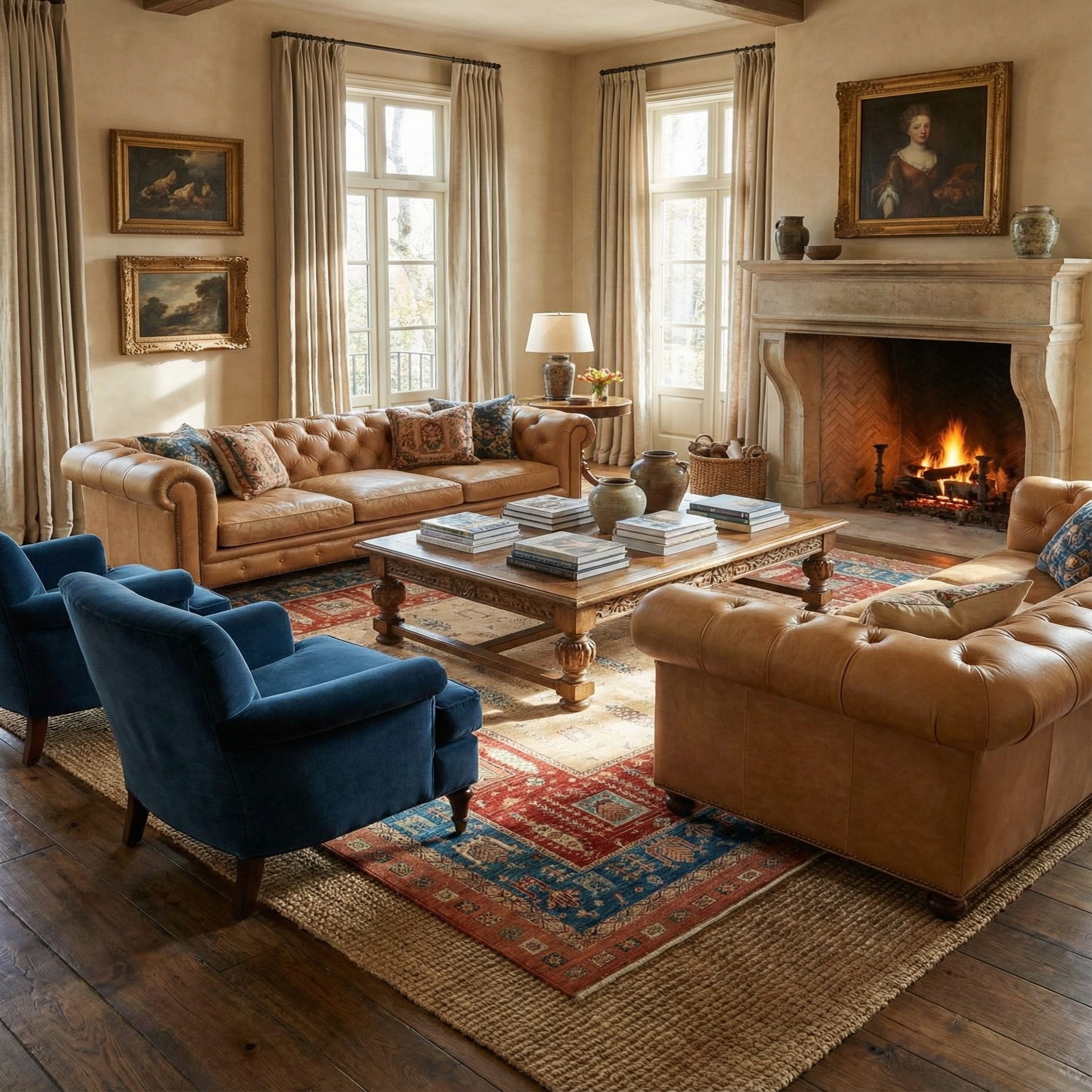 Primary color is Tan. Colors in this rug include: Tan, Beige, Cream, Navy Blue, Orange, Red, Light Blue.
