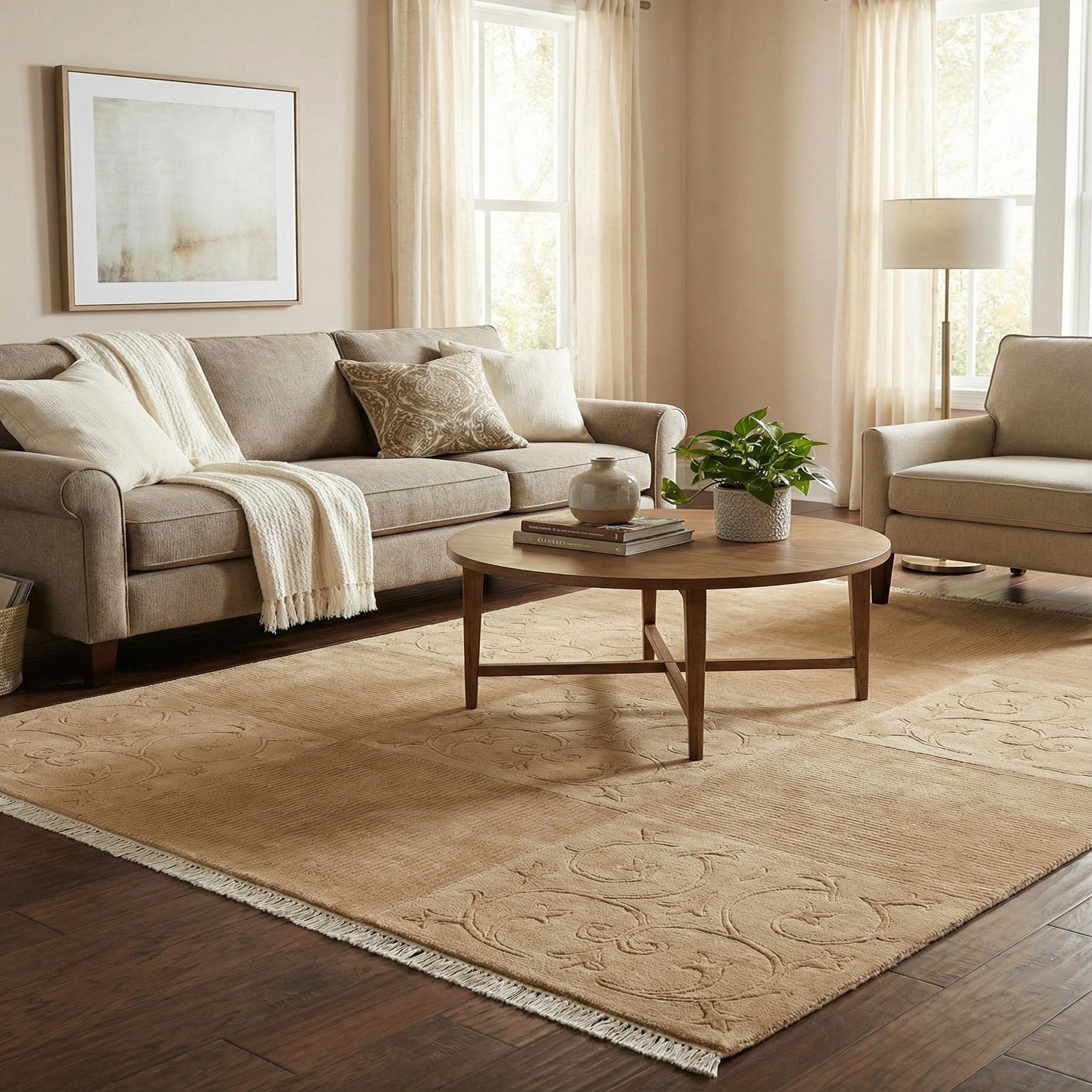 Primary color is Tan. Colors in this rug include: Tan, Light Brown.