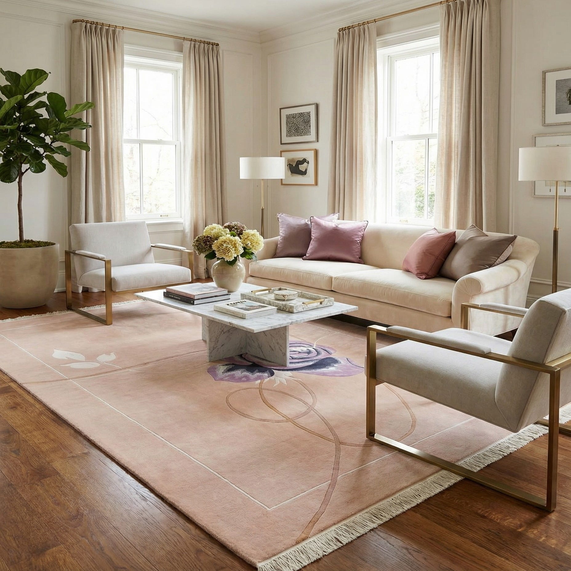 Primary color is Tan. Colors in this rug include: Tan, Beige, Brown, Purple, Ivory.