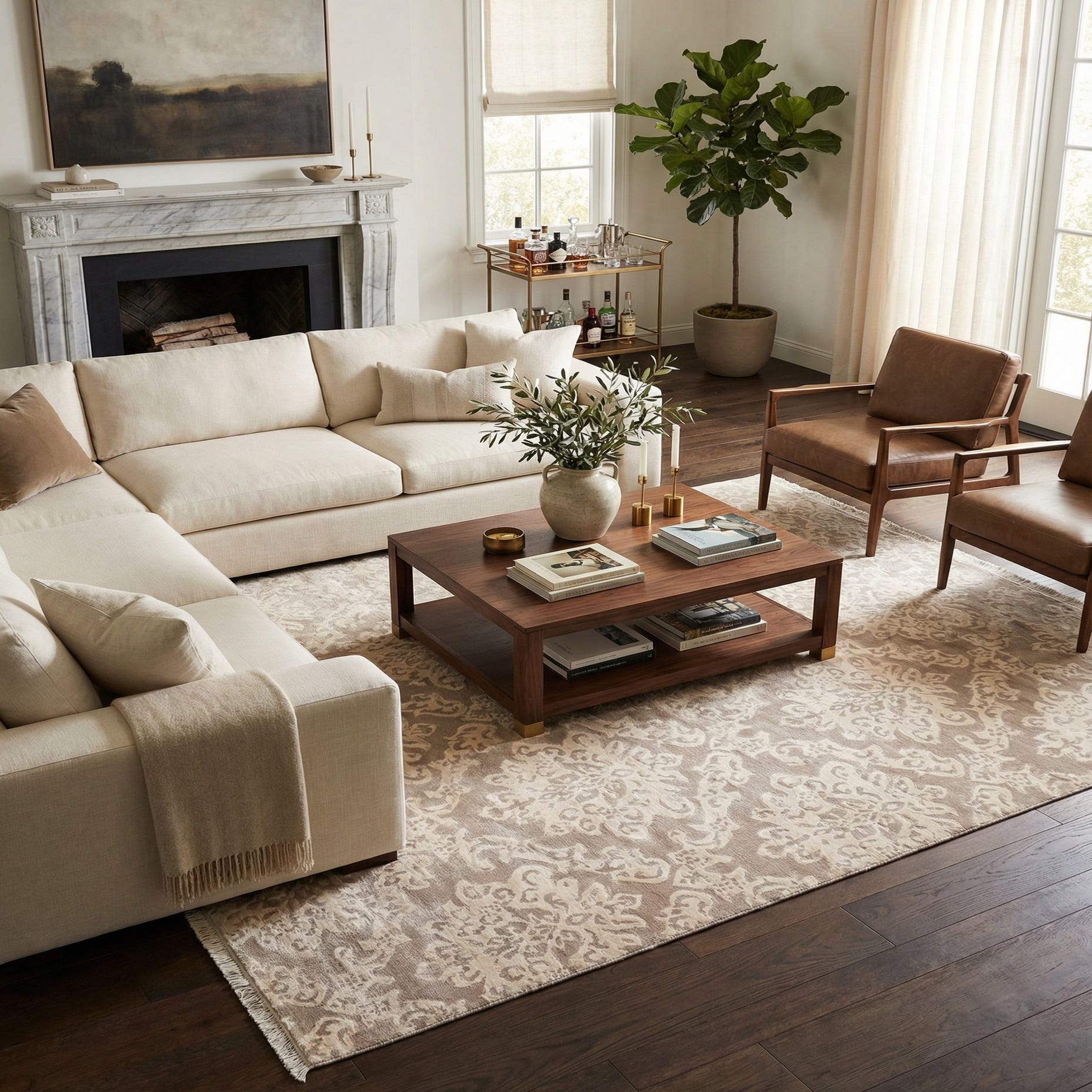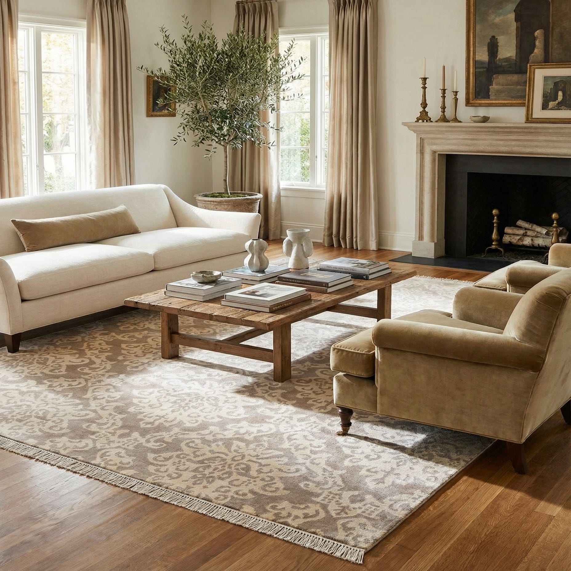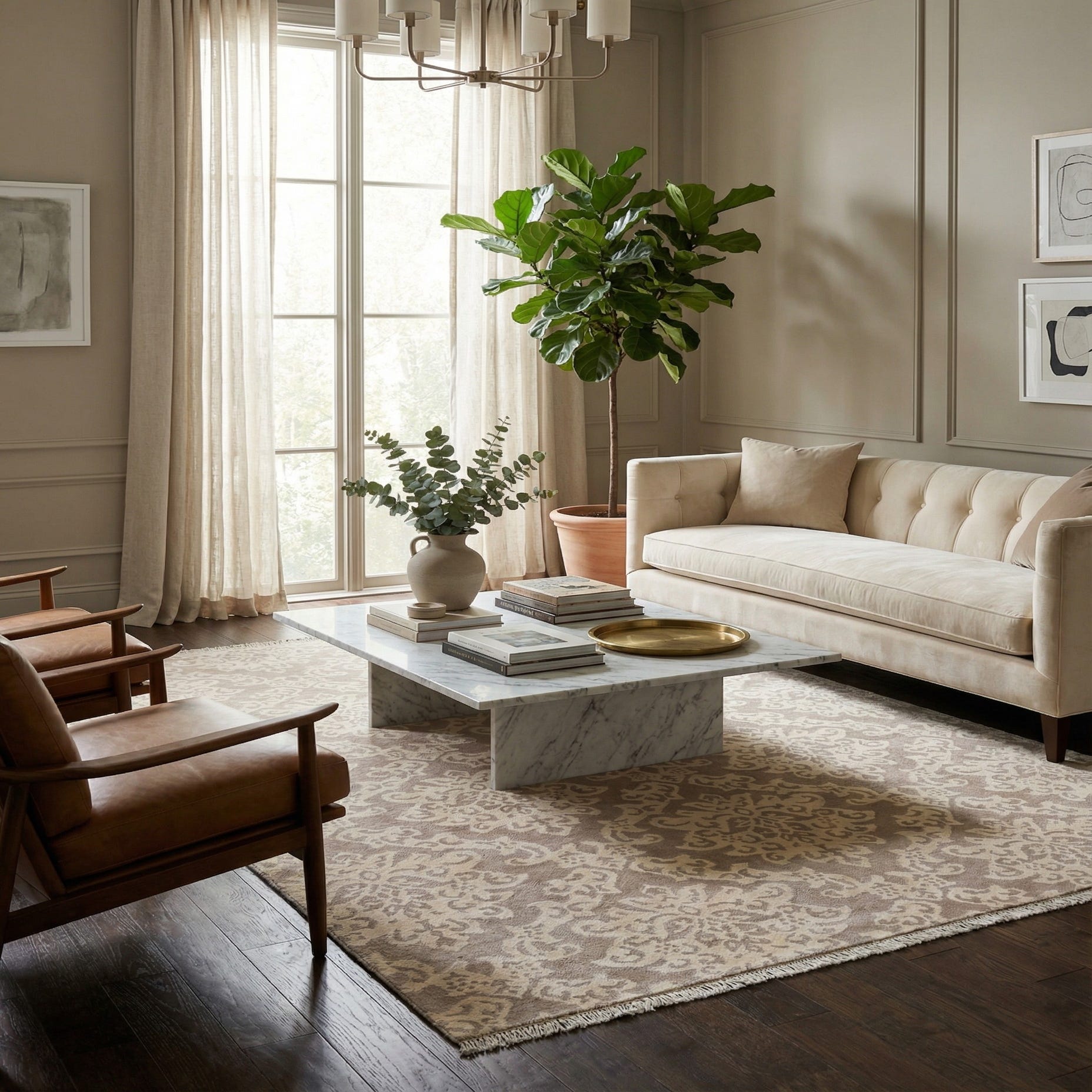 Primary color is Tan. Colors in this rug include: Tan, Beige.