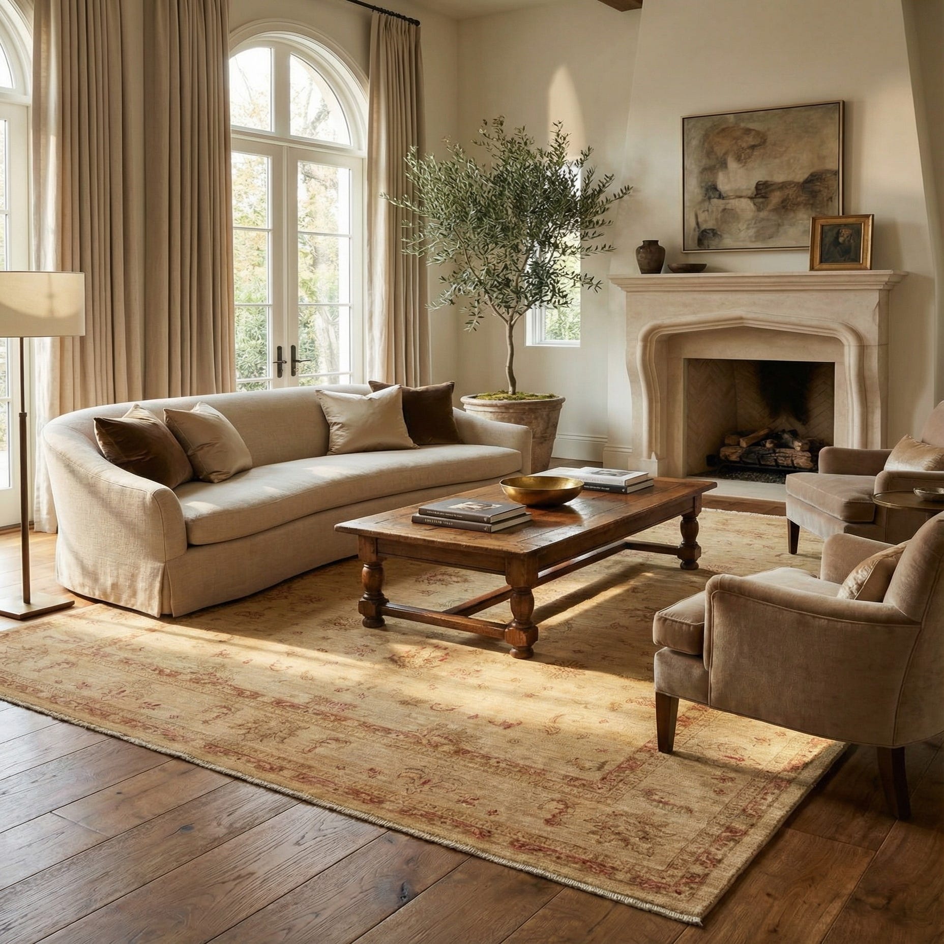 Primary color is Tan. Colors in this rug include: Tan, Beige, Burgundy, Light Green, Olive, Terracotta.