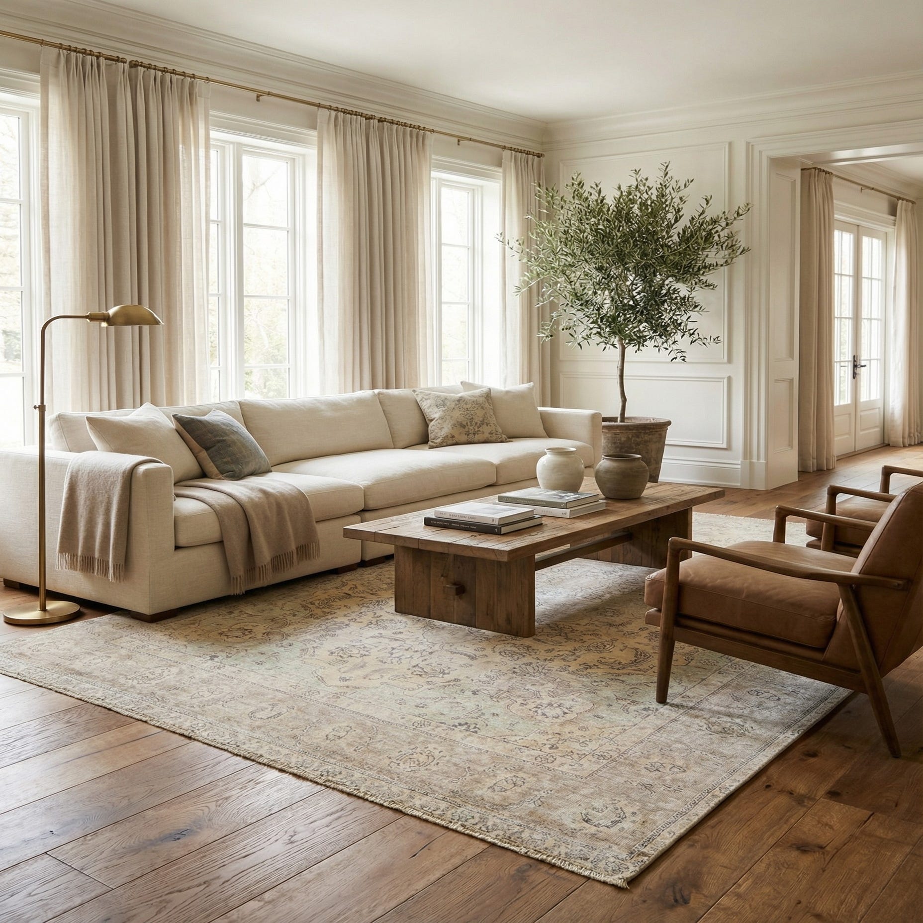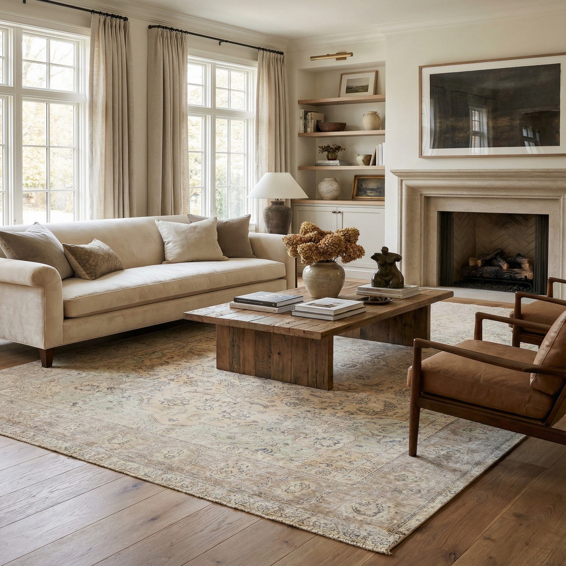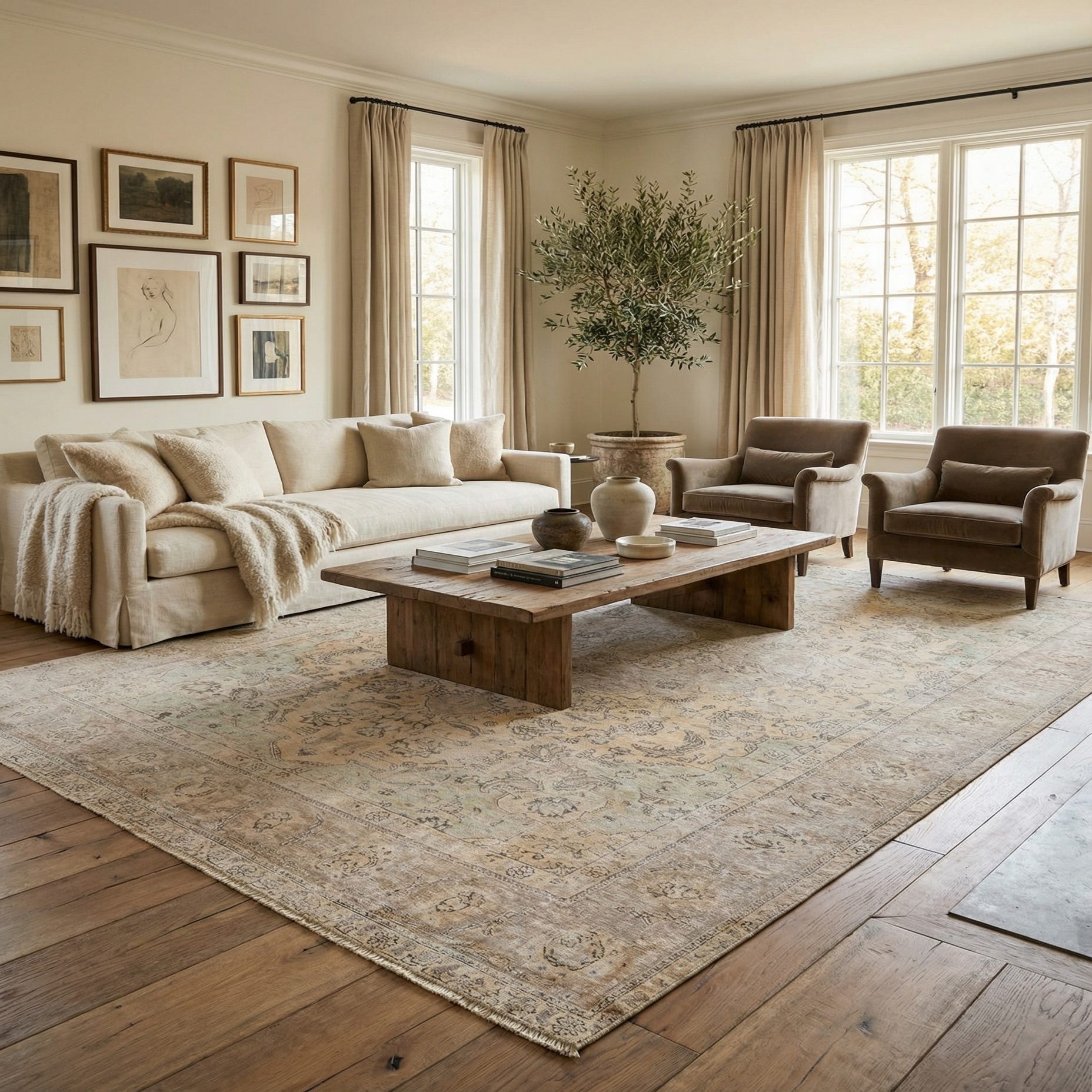 Primary color is Tan. Colors in this rug include: Tan, Brown, Light Green, Ivory.