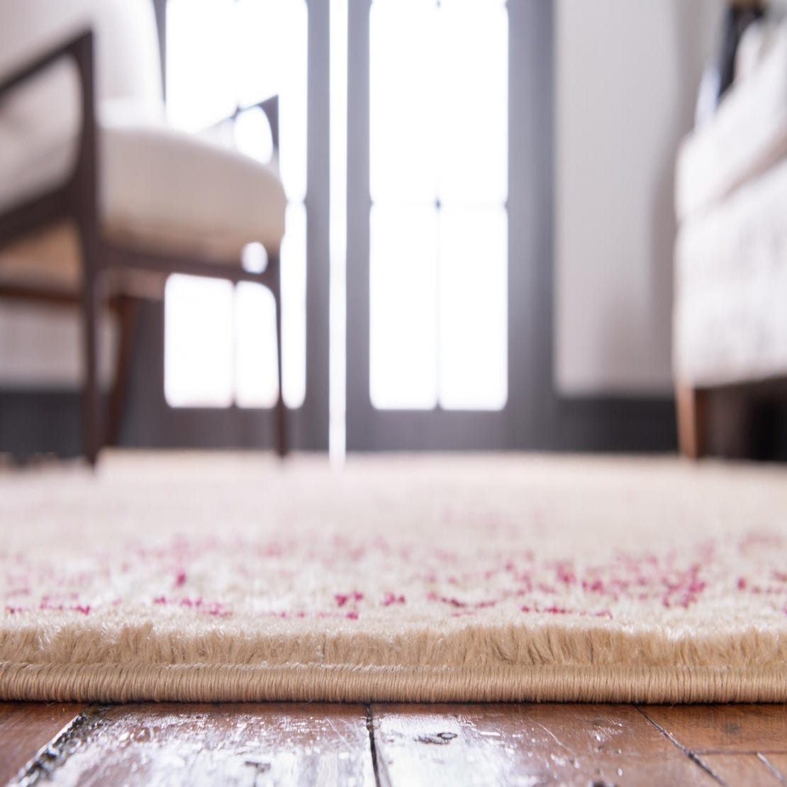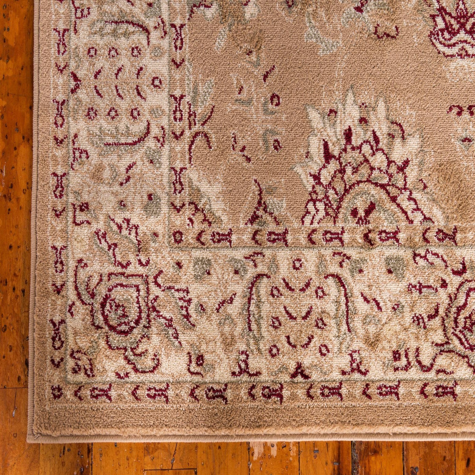 Primary color is Tan. Colors in this rug include: Tan, Cream, Light Green, Red, Beige.