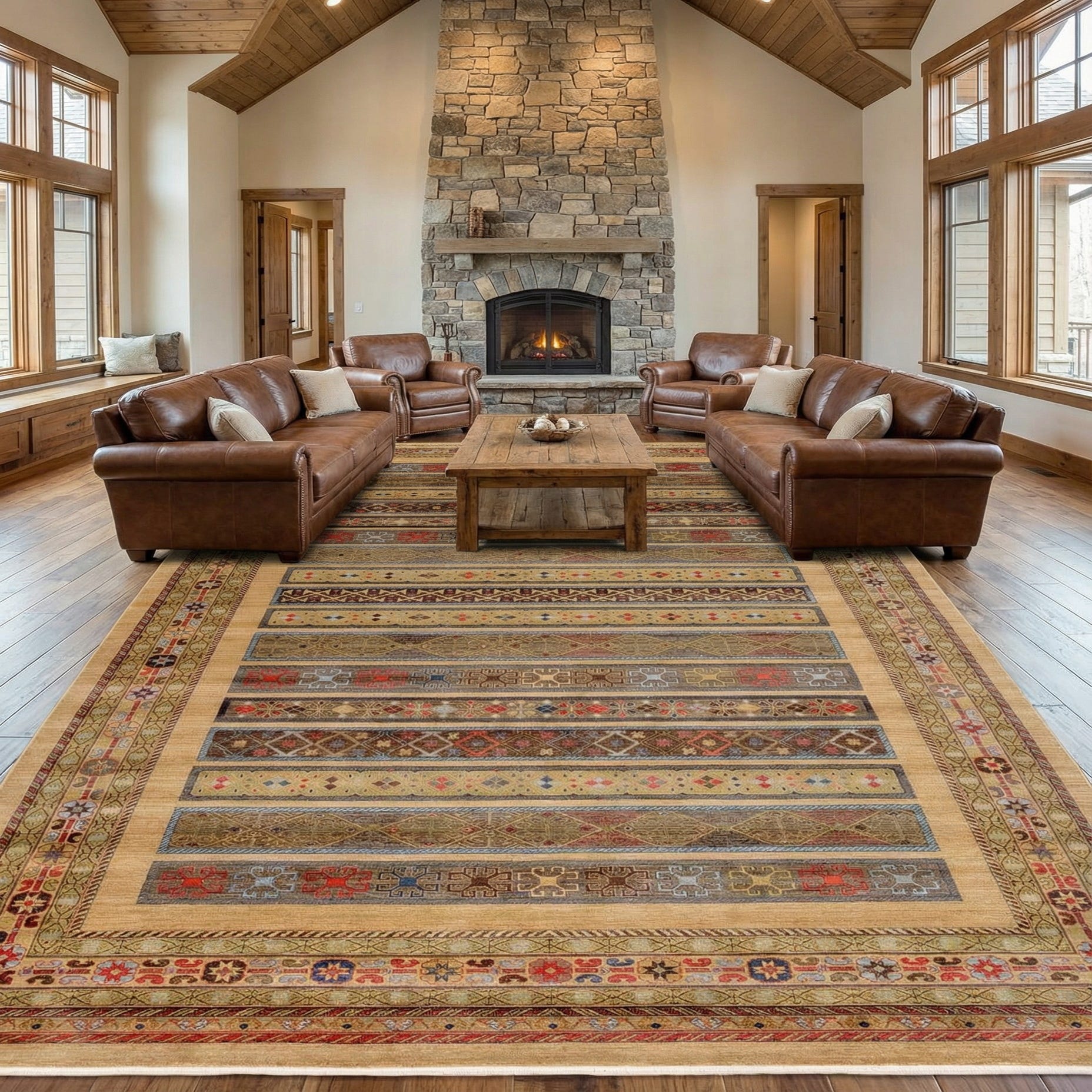 Primary color is Tan. Colors in this rug include: Tan, Blue, Brown, Red, Light Blue, Light Green.