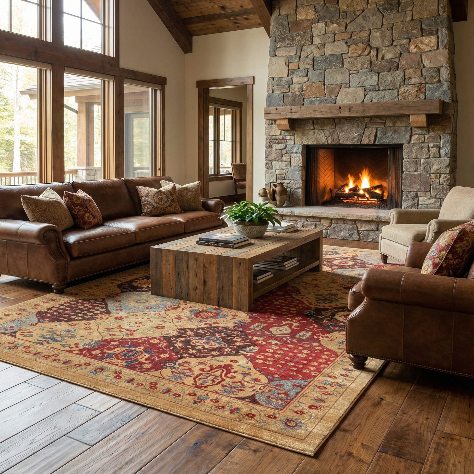 Primary color is Tan. Colors in this rug include: Tan, Red, Brown, Blue, Green, Navy Blue.