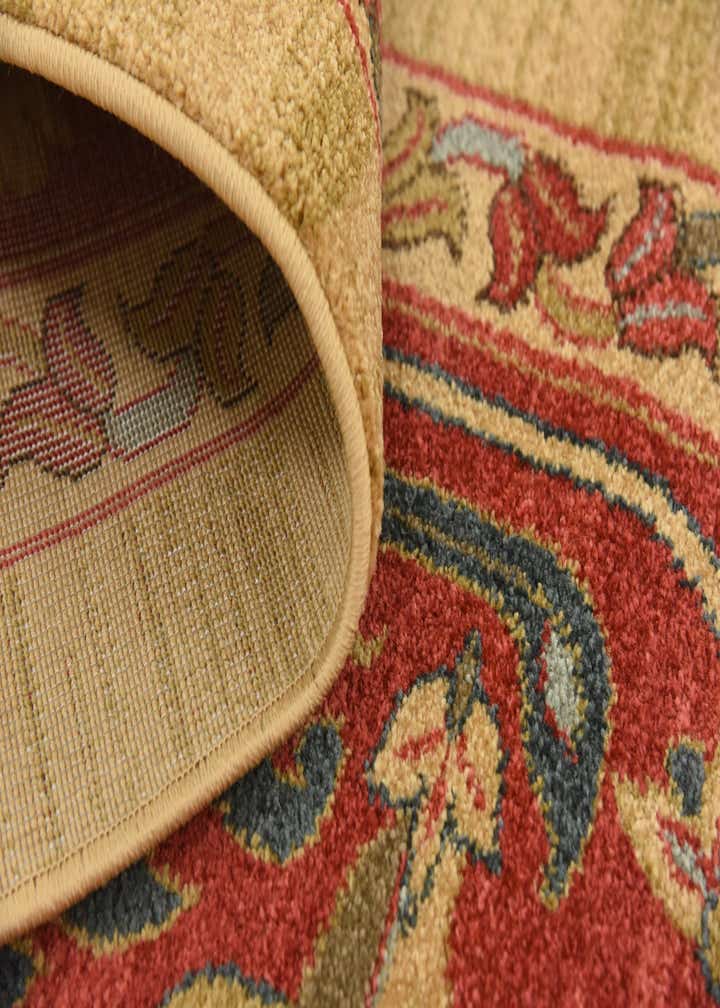 Primary color is Tan. Colors in this rug include: Tan, Light Blue, Light Brown, Light Green, Brown, Navy Blue, Red.